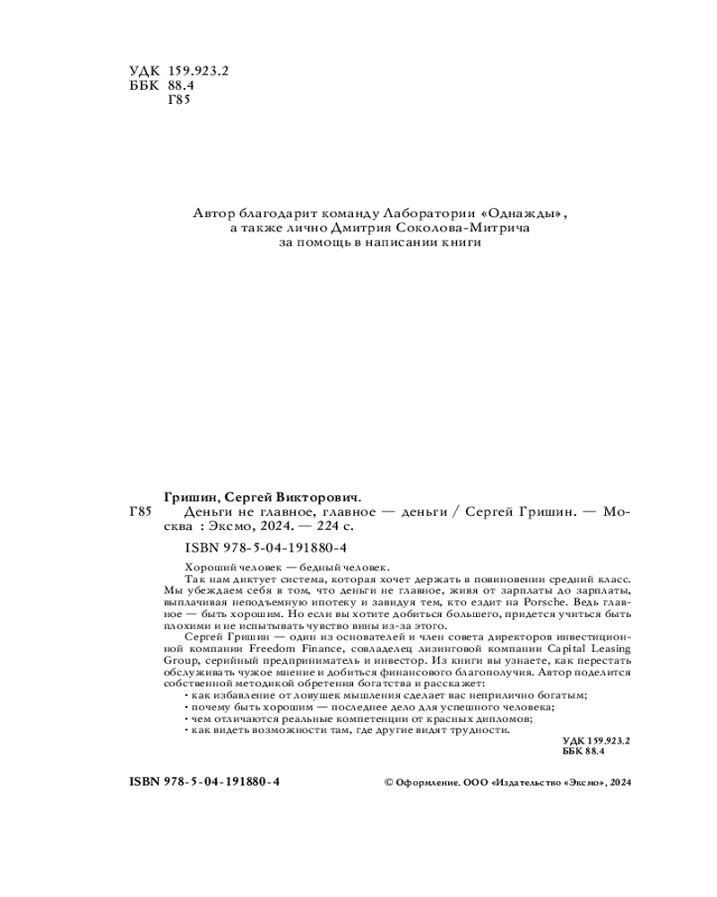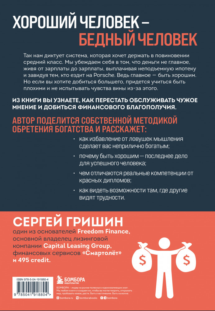 💳 Оплатить за товар можно при получении 🇰🇿 Есть бесплатная доставка по Казахстану от 1 дня 🎁 Копите бонусы с каждой покупки Серия: Книги-драйверы Хороший человек ― бедный человек. Так нам диктует система, которая хочет держать в повиновении средний класс. Мы убеждаем себя в том, что деньги не главное, живя от зарплаты до зарплаты, выплачивая неподъемную ипотеку и завидуя тем, кто ездит на Porsche. Ведь главное ― быть хорошим. Но если вы хотите добиться большего, придется учиться быть плохими и не испытывать чувство вины из-за этого. |