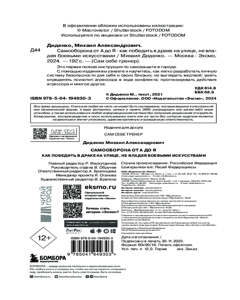 💳 Оплатить за товар можно при получении 🇰🇿 Есть бесплатная доставка по Казахстану от 1 дня 🎁 Копите бонусы с каждой покупки Серия: Сам себе тренер Михаил Диденко — сертифицированный инструктор по рукопашному бою и выживанию. Автор таких книг, как «Психология и практика уличной схватки», «Мужское поведение на улице и в жизни», «Принципы рукопашного боя для лидеров», «Русский стиль выживания», «Крестик», а также ряда публикаций в СМИ на темы эффективного поведения в экстремальной ситуации и боевых традиций. Это первая инструкция по самозащите в городе. |