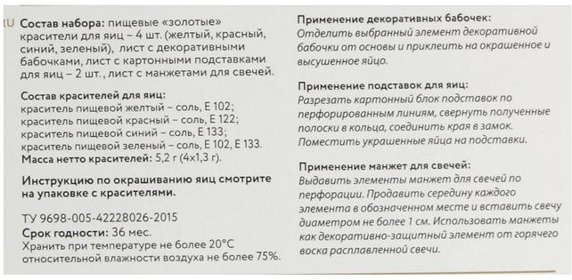Светлый Праздник Набор пасхальный для декорирования яиц «Бабочки»В данный момент этот товар отсутствует в продаже. Возможно, у нас найдется аналогичный или похожий товар здесь. Этот подарочный набор для творчества поможет весело провести время всей семьей, готовясь к пасхе. В него входят блестящие красители, декоративные бабочки, подставки для яиц и манжеты для свечей. С помощью такого набора можно создать не только традиционные атрибуты праздника, но и оригинальную композицию. |