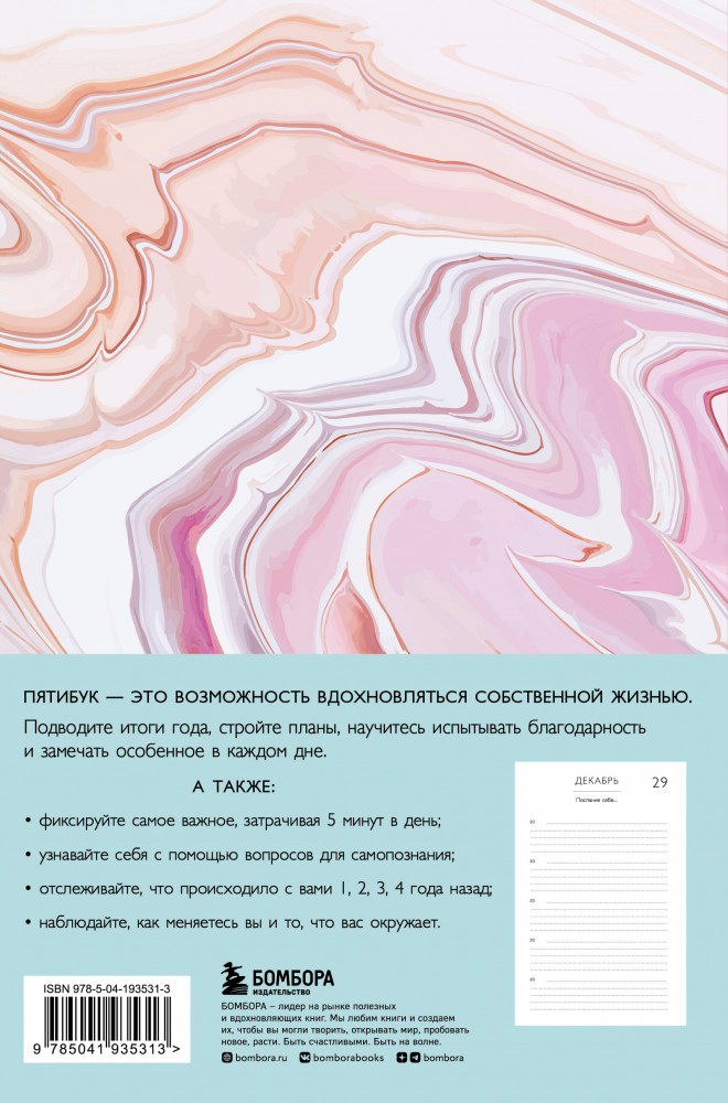 💳 Оплатить за товар можно при получении 🇰🇿 Есть бесплатная доставка по Казахстану от 1 дня 🎁 Копите бонусы с каждой покупки Серия: Пятибуки. Дневники на 5 лет Напишите удивительную книгу своей жизни. Каждый день вас ждет вопрос, который поможет отвлечься от будничной суеты или разобраться с собственными мыслями. Открывайте, рискуйте, чувствуйте и записывайте! Пятибук станет отличным подарком для себя или близких. А формат книжки впишется на вашу полку. |