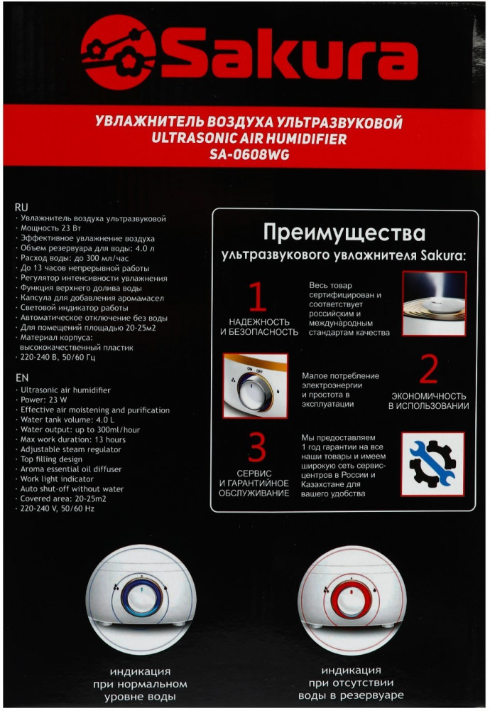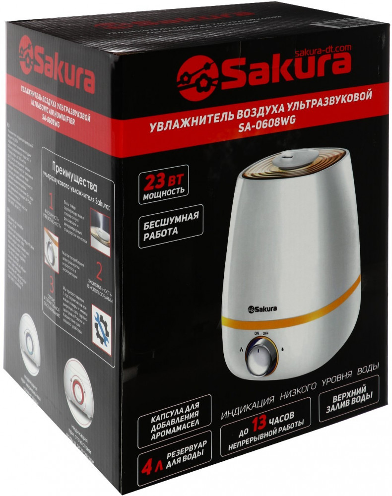 Sakura Увлажнитель воздуха SA-0608WGВ данный момент этот товар отсутствует в продаже. Возможно, у нас найдется аналогичный или похожий товар здесь. Увлажнитель воздуха Sakura SA-0608WG предназначен для создания комфортной атмосферы в помещении. Имеет ультразвуковую технологию увлажнения воздуха. Оснащён световым индикатором работы. Функция верхнего долива воды. Капсула для добавления аромамасел. Автоматическое отключение. |