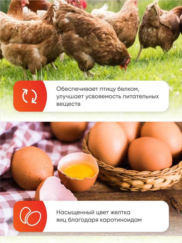 Кормовая добавка отличается высоким содержанием белка, которого обычно так не хватает птице на домашнем подворье. Белок — главный строительный материал, из которого «строятся» клетки организма и яйца. Если в рационе птицы не хватает белка, высокой яйценоскости не будет. При этом может развиваться ожирение птицы и потеря ею продуктивных качеств. Кормовая добавка «Желток» обеспечивает птицу белком и балансирует кормовой рацион.