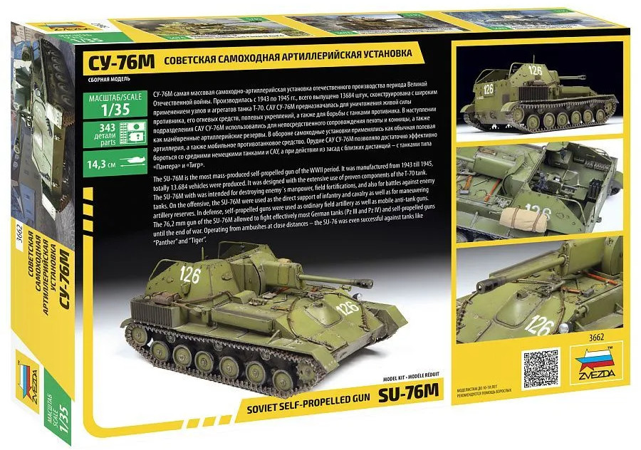Звезда сборная пластиковая модель Советской самоходной артиллерийской установки СУ-76М в масштабе 1/35. Детали модели не окрашены. Клей и краски в комплект не входят и приобретаются отдельно. Моделистам младше 10 лет может понадобиться помощь взрослых при сборке модели.