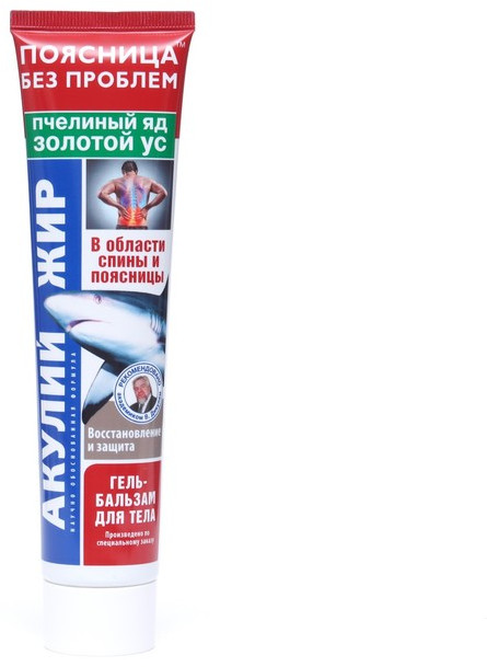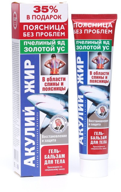 Гель-бальзам для тела «Акулий жир» с пчелиным ядом и с золотым усом способствует снятию признаков воспаления, выведения накопленных токсинов, поэтому могут использоваться для лечения артритов, снятия мышечных, суставных болей, после радиоактивного воздействия для предотвращения развития осложнений. Акулий жир способен нормализовать обменные процессы не только внутри суставов конечностей, но и внутри межпозвоночных дисков. Он также укрепляет мышцы и связки, и способен избавить от солевых отложений. Ускоряет процессы регенерации при повреждениях хрящей и костей, предотвращает разрушение хрящей, ускоряет заживление переломов, снимает болевой синдром, повышает эластичность соединительной ткани.
