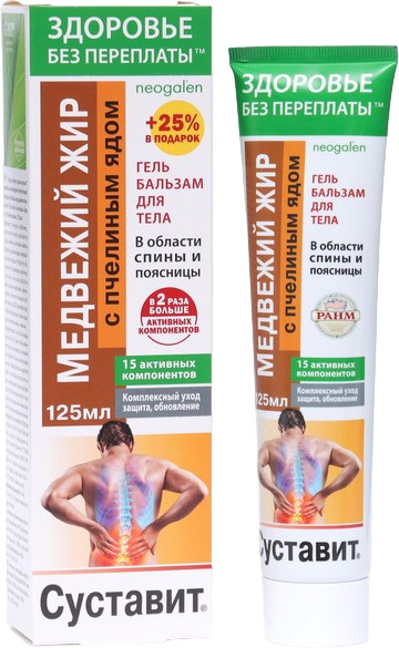 Гель-бальзам для тела «Суставит. Медвежий жир» с пчелиным ядом способствует нормализации функционального состояния. Обеспечивает структурными элементами для активного обновления и гибкости. Стимулирует естественную регенерацию тканей, препятствует развитию деструктивных процессов и старению. Действие и эффективность геля-бальзама обеспечены высокой биологической активностью его натуральных компонентов, обладающих выраженным положительным комплексным действием.