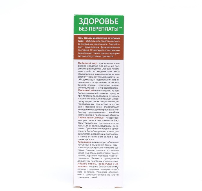 Пчелиный яд — продукт секреторной деятельности ядовитых желез медоносных пчёл, высокоэффективное натуральное средство для лечения заболеваний суставов и позвоночника. Содержит белковые вещества, липиды, биогенные амины, ортофосфорную и нуклеиновую кислоты, комплекс ценных микро- и макроэлементов. Обладает выраженным противовоспалительным, разогревающим, обезболивающим, бактерицидным, иммунокорректирующим действием, активизирует кровоток, улучшает обмен веществ в суставе и питание суставных тканей. Стимулирует регенерацию костной и хрящевой ткани при заболеваниях суставов, улучшает качество синовиальной жидкости, заживляет суставные микро травмы, ускоряет сращивание костей при переломах. Корни содержат рекордное количество аллантоина, полисахариды, алкалоиды,гликозиды, полифенолы, тритерпеновые сапонины, фитостерины, танины,кумарины, органические кислоты.