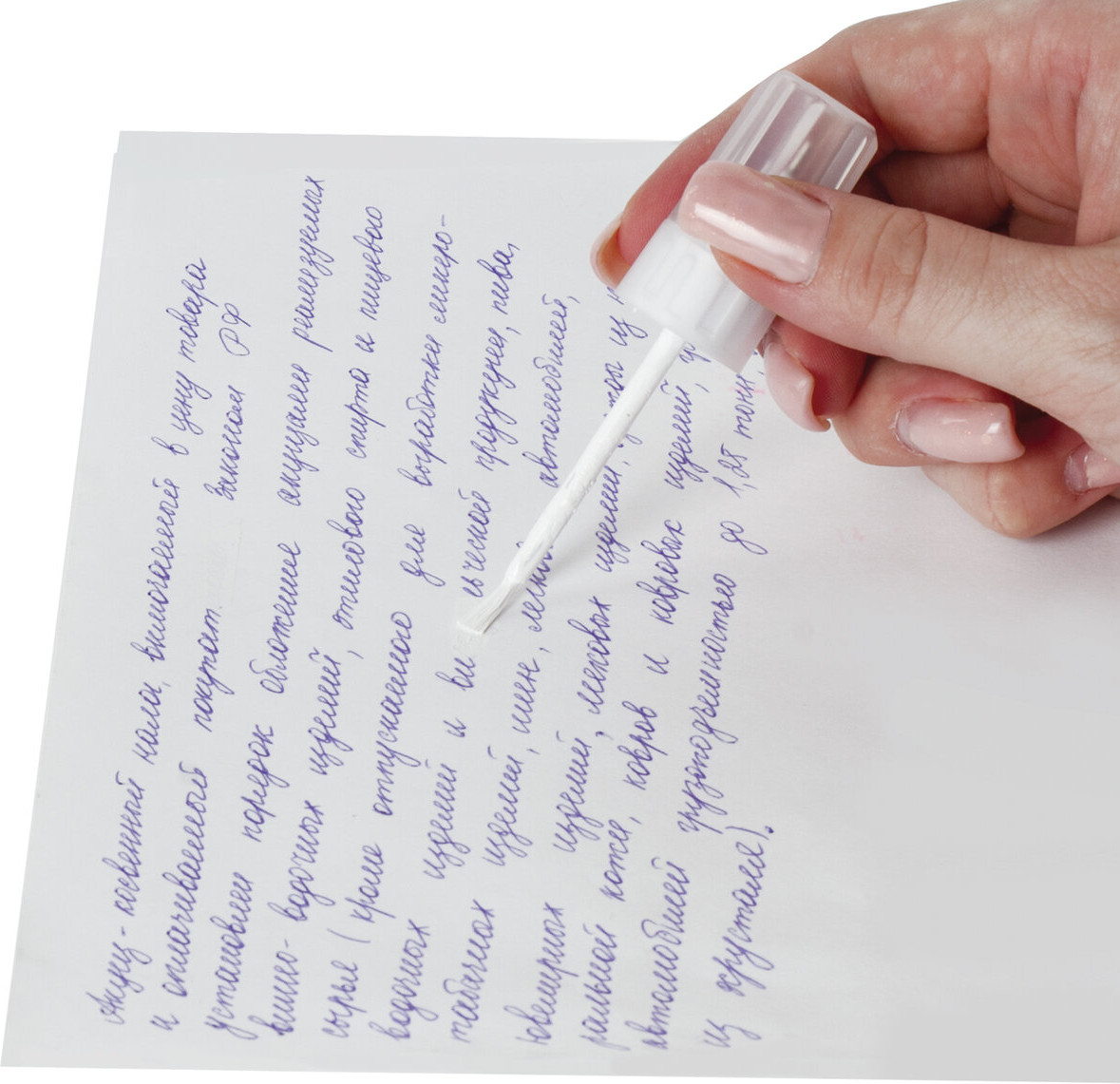Легко использовать. Корректирующая жидкость легко выходит из наконечника при надавливании на бумагу