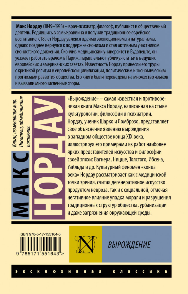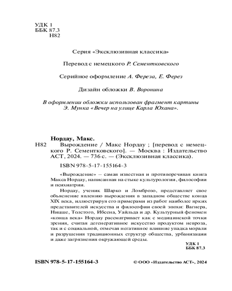 💳 Оплатить за товар можно при получении 🇰🇿 Есть бесплатная доставка по Казахстану от 1 дня 🎁 Копите бонусы с каждой покупки Серия: Эксклюзивная классика «Вырождение» — самая известная и противоречивая книга Макса Нордау, написанная на стыке культурологии, философии и психиатрии. |