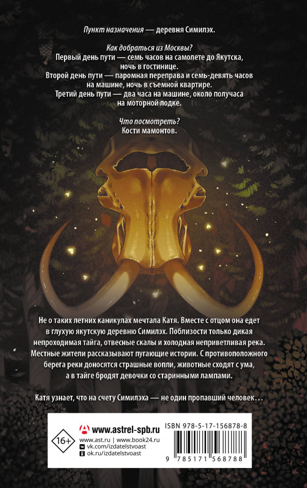 💳 Оплатить за товар можно при получении 🇰🇿 Есть бесплатная доставка по Казахстану от 1 дня 🎁 Копите бонусы с каждой покупки Серия: Формула мистики Пункт назначения — деревня Симилэх. Как добраться из Москвы? Первый день пути — семь часов на самолете до Якутска, ночь в гостинице. Второй день пути — паромная переправа и семь-девять часов на машине, ночь в съемной квартире. Третий день пути — два часа на машине, около получаса на моторной лодке. Что посмотреть? Кости мамонтов. Не о таких летних каникулах мечтала Катя. Вместе с отцом она едет в глухую якутскую деревню Симилэх. Поблизости только дикая непроходимая тайга, отвесные скалы и холодная неприветливая река. Местные жители рассказывают пугающие истории. С противоположного берега реки доносятся страшные вопли, животные сходят с ума, а в тайге бродят девочки со старинными лампами. Катя узнает, что на счету Симилэха — не один пропавший человек. |