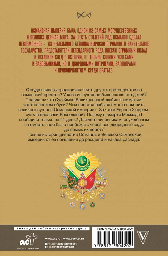 💳 Оплатить за товар можно при получении 🇰🇿 Есть бесплатная доставка по Казахстану 🎁 Копите бонусы с каждой покупки Серия: Династия Османская империя одна из самых могущественных и великих держав. За шесть столетий род Осман сделал невозможное, и из небольшого бейлика выросло огромное и влиятельное государство. Представители рода Осман внесли огромный вклад и оставили след в истории, не только своими успехами и завоеваниями, но и дворцовыми интригами, заговорами и кровопролитием среди братьев. |