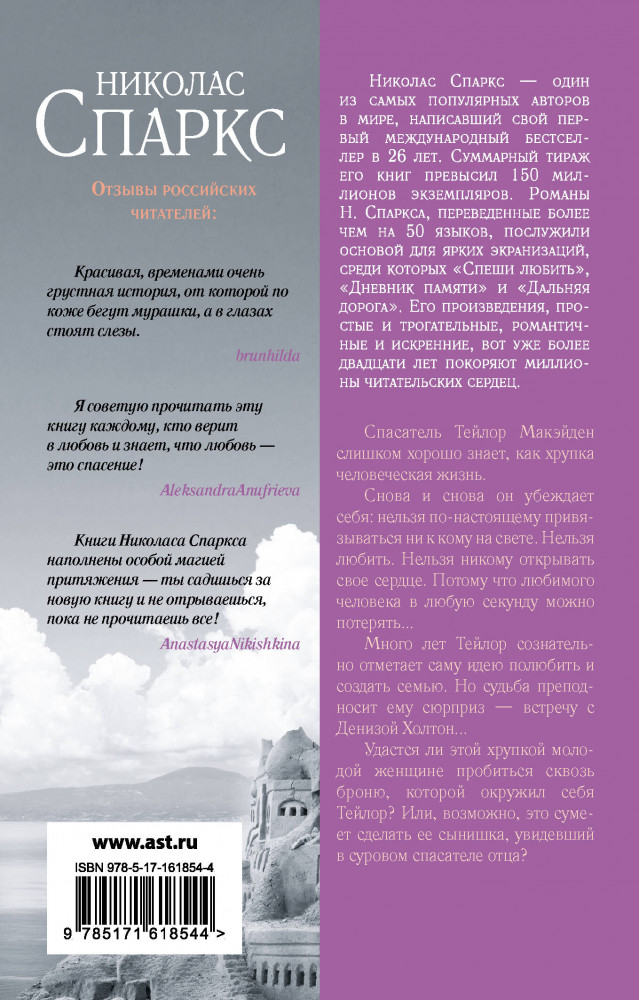 СпасениеВ данный момент этот товар отсутствует в продаже. Возможно, у нас найдется аналогичный или похожий товар здесь. Серия: Спаркс: чудо любви (м) Спасатель Тейлор Макэден слишком хорошо знает, как хрупка человеческая жизнь. Снова и снова он убеждает себя: нельзя по-настоящему привязываться ни к кому на свете. Нельзя любить. Нельзя никому открывать свое сердце. Потому что любимого человека в любую секунду можно потерять... Много лет Тейлор сознательно отметает даже саму идею полюбить и создать семью. Но судьба преподносит ему сюрприз — встречу с Денизой Холтон... Удастся ли этой хрупкой молодой женщине пробиться сквозь броню, которой окружил себя Тейлор? Или, возможно, это сумеет сделать ее сынишка, увидевший в суровом спасателе отца? |