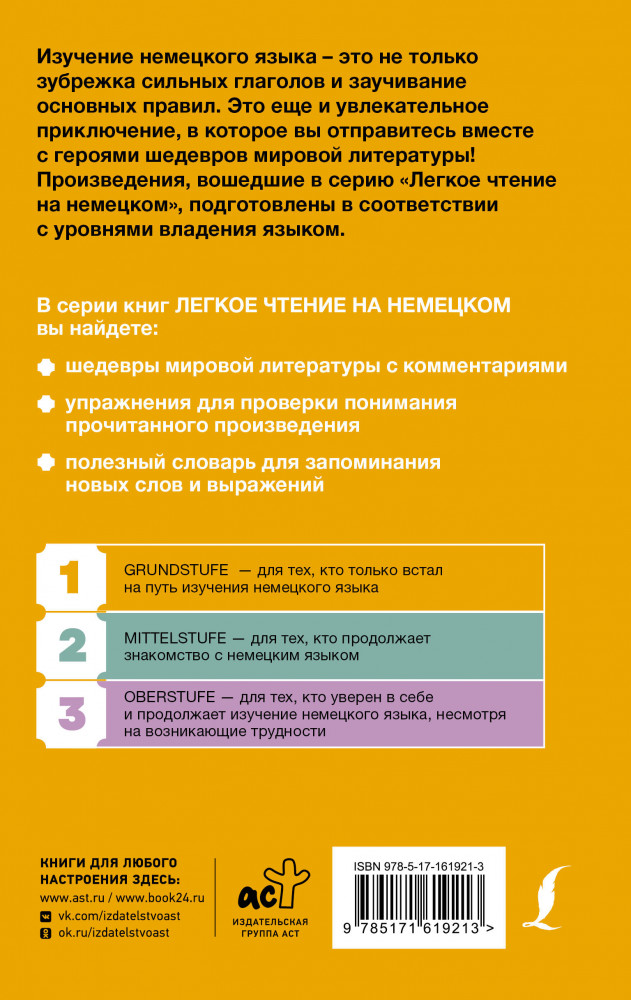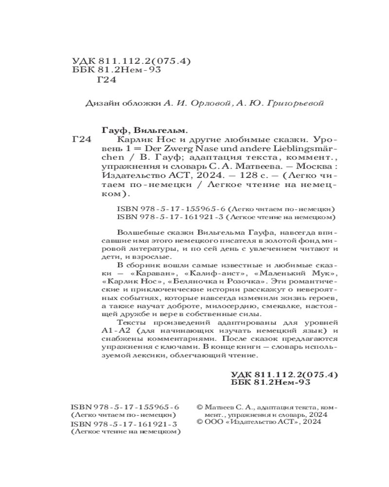 💳 Оплатить за товар можно при получении 🇰🇿 Есть бесплатная доставка по Казахстану от 1 дня 🎁 Копите бонусы с каждой покупки Серия: Легкое чтение на немецком Волшебные сказки Вильгельма Гауфа, навсегда вписавшие имя этого немецкого писателя в золотой фонд мировой литературы, и по сей день с увлечением читают и дети, и взрослые. |