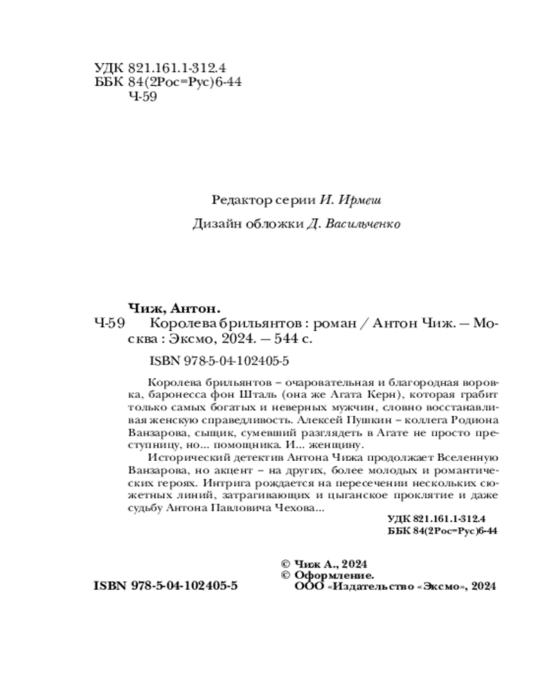 В данный момент этот товар отсутствует в продаже. Возможно, у нас найдется аналогичный или похожий товар здесь. Серия: Исторические детективы Антона Чижа (цикл «Агата и сыск»). Новое оформление (обложка) Королева брильянтов — очаровательная и благородная воровка, баронесса фон Шталь (она же Агата Керн), которая грабит только самых богатых и неверных мужчин, словно восстанавливая женскую справедливость. Алексей Пушкин — коллега Родиона Ванзарова, сыщик, сумевший разглядеть в Агате не просто преступницу, но... помощника. И... женщину.