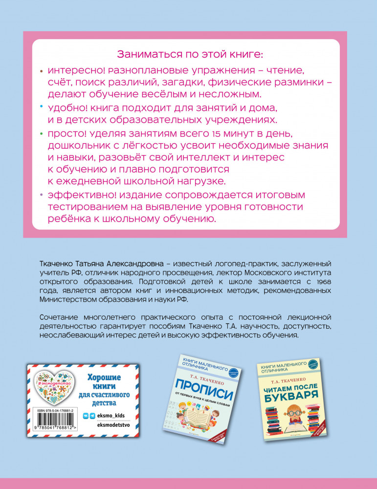 💳 Оплатить за товар можно при получении 🇰🇿 Есть бесплатная доставка по Казахстану от 1 дня 🎁 Копите бонусы с каждой покупки Серия: Татьяна Ткаченко. Книги маленького отличника Наиболее полное пособие по системе Ткаченко для подготовки ребенка к школе — расширенный курс по чтению, письму и основам математики. Можно готовиться по нему как отдельно, так и в качестве продолжения после «Курса маленького отличника 5–6 лет». Разноплановые задания позволят ученику закрепить ранее пройденный материал и усовершенствовать навыки. Эта книга, несомненно, настольный помощник всех родителей и логопедов. Она доказывает, что учиться можно с удовольствием! |