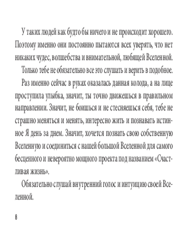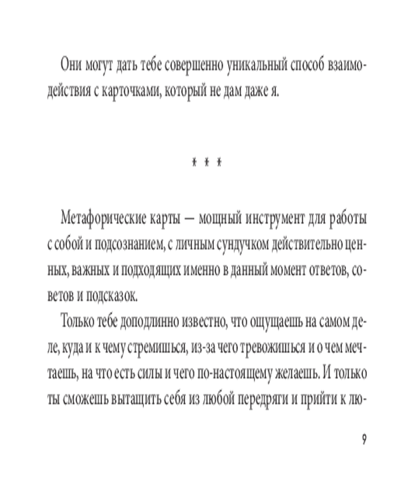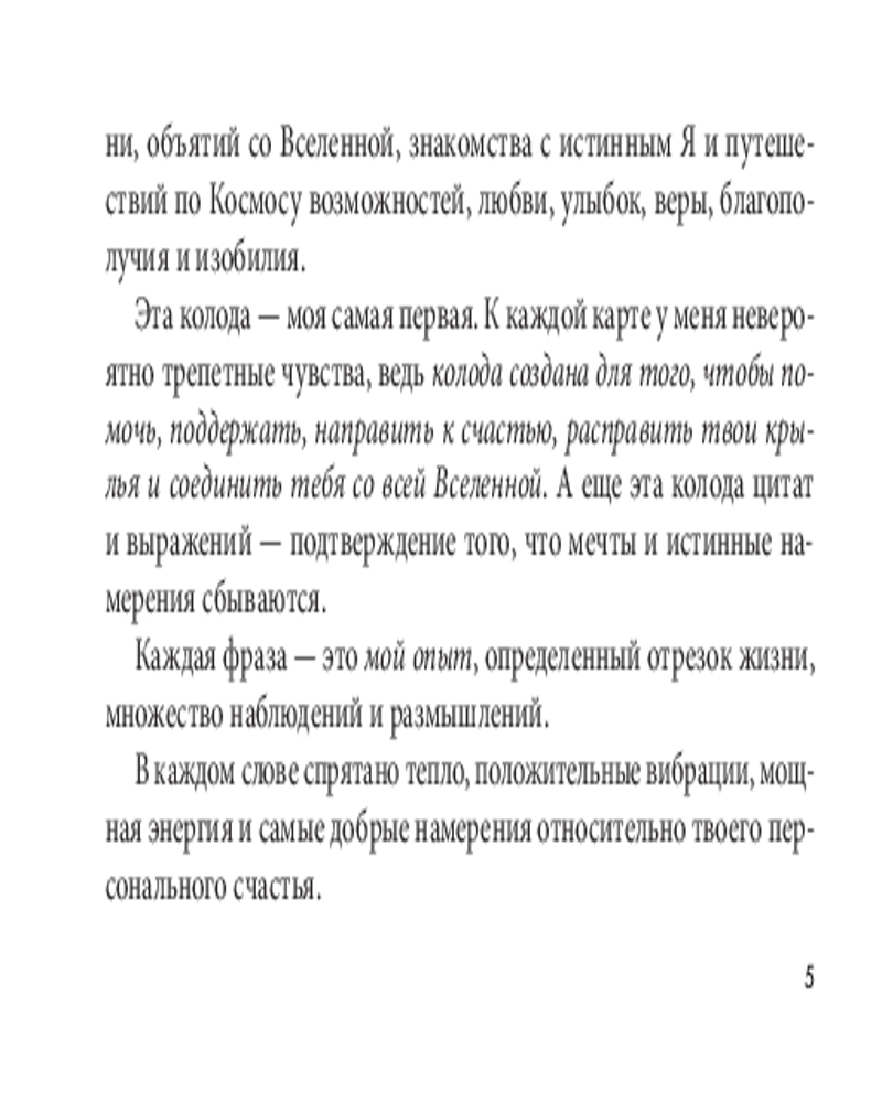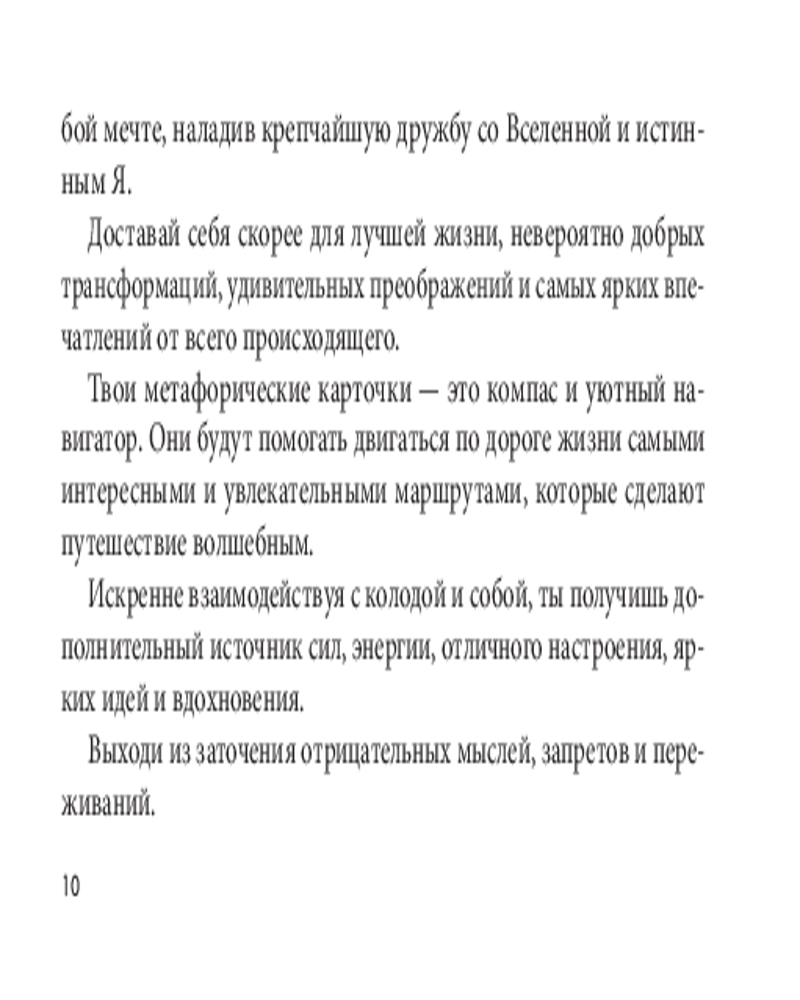 Сами карты хорошие, терапевтичные, на каждой позитивное мотивирующее утверждение. Но вот упаковка подвела: картон коробки очень мягкий, размер коробки больше карт, из-за этого произошла деформация упаковки по бокам и вверху. Хотела подарить, но вид непрезентабельный, оставлю себе.