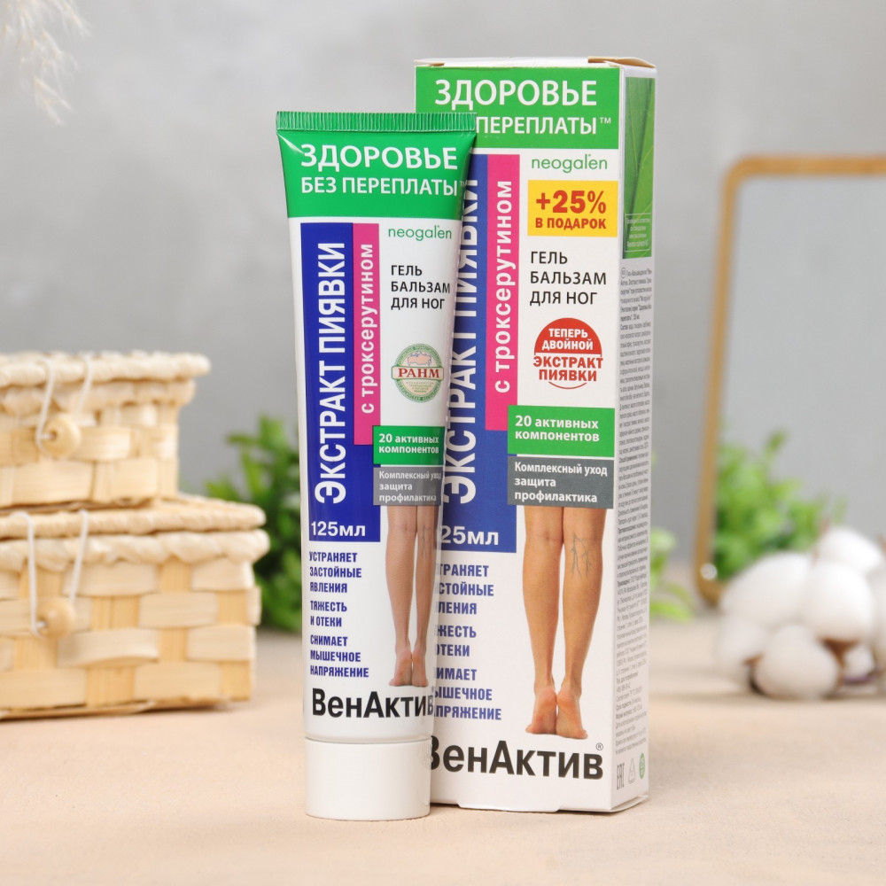 💳 Оплатить за товар можно при получении 🇰🇿 Есть бесплатная доставка по Казахстану от 1 дня 🎁 Копите бонусы с каждой покупки Серия: Здоровье без переплаты Эффективное средство на основе натуральных биоактивных компонентов. Способствует устранению усталости и тяжести в ногах, уменьшению вечерних отеков. Оказывает комплексное положительное действие. Способствует активизации функции венозных клапанов, микро циркуляции и лимфооттока. Снижает риск возникновения трофических изменений кожи (сухость, шелушение, истонченность). Питает, смягчает, увлажняет и освежает кожу ног. Эффективность и безопасность геля-бальзама для ног обеспечена синергизмом активных природных компонентов. Медицинская пиявка способствуют образованию новых капилляров, в результате чего улучшается микроциркуляция крови и разгружается венозная система. Ферменты пиявки ускоряют заживление трофических язв, улучшают состояние кожи. Троксерутин обеспечивает комплексное решение проблемы варикоза, укрепляет вены и повышает их тонус, снижает ломкость капилляров, препятствует отечности и улучшает эстетический вид ног. |