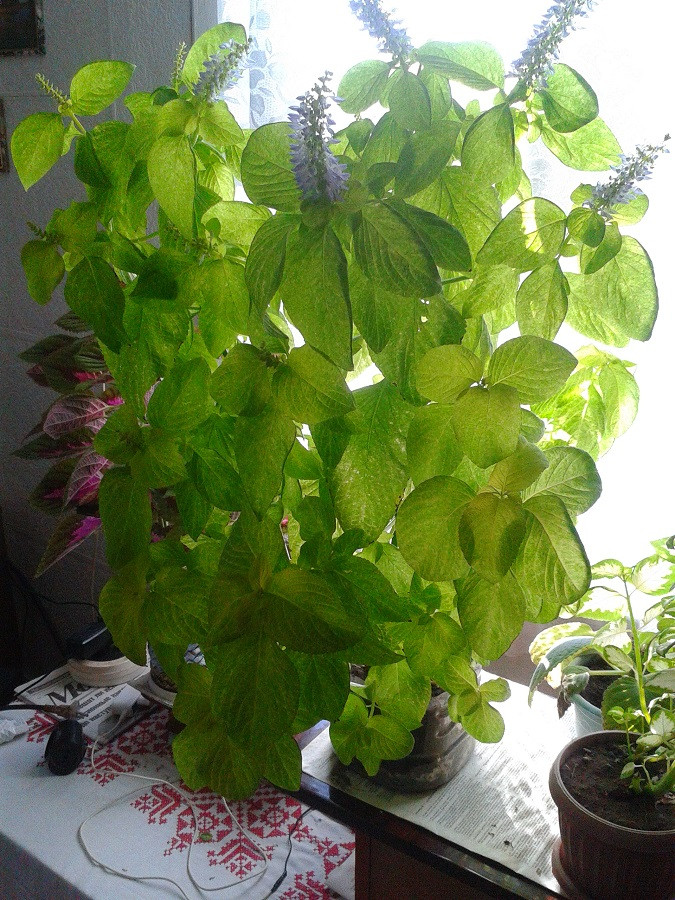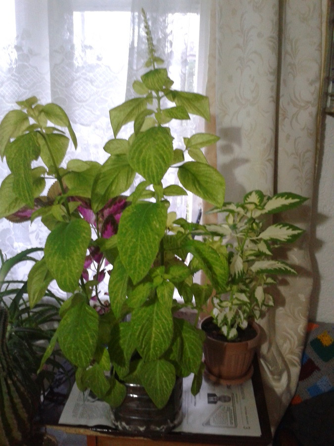Прекрасный колеус, но очень много воды пьет, грунт мгновенно высыхает, поливаю каждый день, однажды пропустила полив, он превратился в тряпочку, думала всё, но полила в надежде, что восстановится и действительно пришел в себя, выпрямился, растет дальше. Это летом растет шикарно, а зимой листья сбрасывает и останавливает рост. Весной я либо черенкую, либо обрезаю, чтобы появились новые ростки.