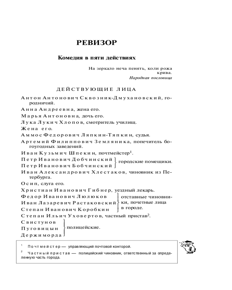 Комедия «Ревизор» рассказывает о жизни маленького провинциального городка и его обитателях, мирную жизнь которых однажды нарушила новость о приезде проверки из Петербурга. В персонажах пьесы автор заключил сатирическое изображение человеческих недостатков: трусости, лицемерия, алчности, показав, что проявление этих качеств никогда ни к чему хорошему не приводит.