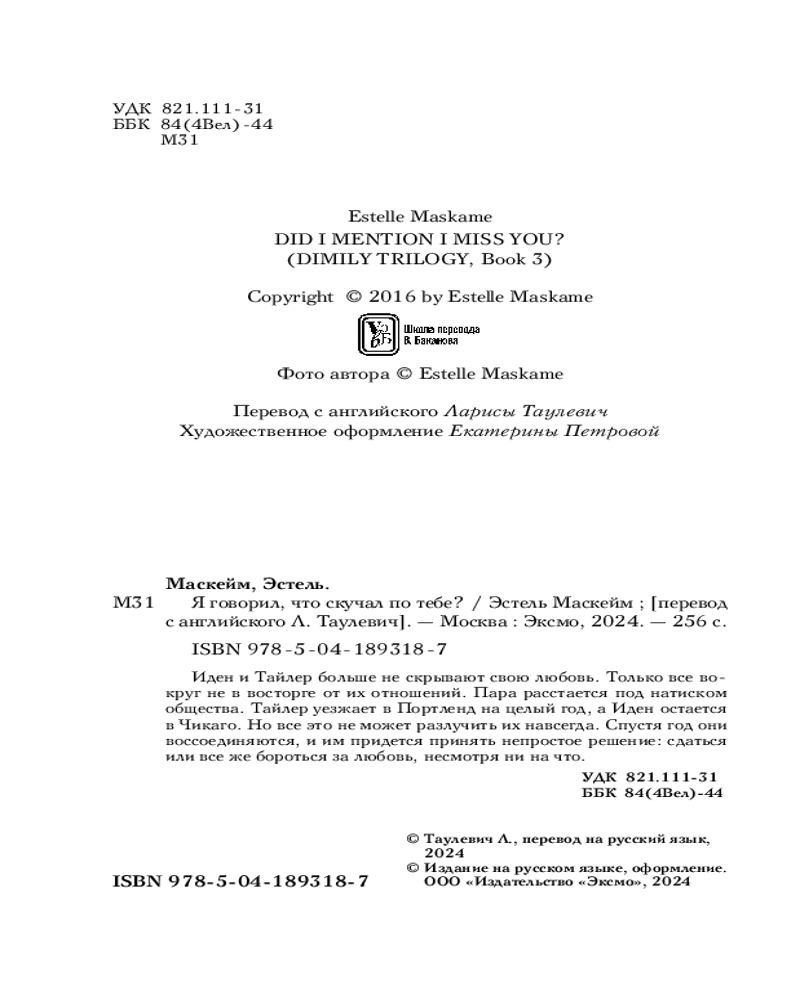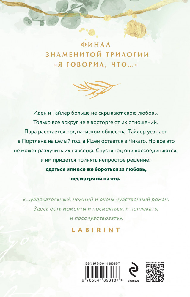 💳 Оплатить за товар можно при получении 🇰🇿 Есть бесплатная доставка по Казахстану от 1 дня 🎁 Копите бонусы с каждой покупки Серия: Модное чтение. Проза Эстель Маскейм (новое оформление, обложка) Любовь или правила? Ставки очень высоки. Иден и Тейлор больше не скрывают свою любовь. Только все вокруг не в восторге от их отношений. Пара расстается под натиском общества. Тайлер уезжает в Портленд на целый год, а Иден остается в Чикаго. Но все это не может разлучить их навсегда. Спустя год они воссоединяются, и им придется принять непростое решение: сдаться или все же бороться за любовь, несмотря ни на что. |