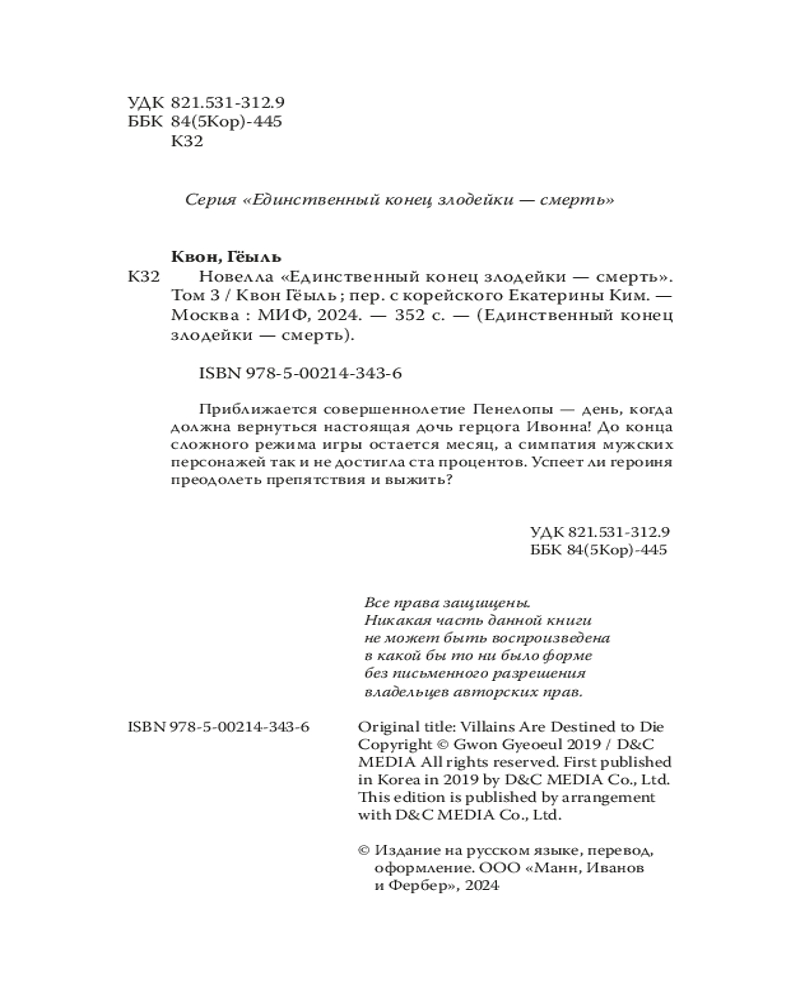 💳 Оплатить за товар можно при получении 🇰🇿 Есть бесплатная доставка по Казахстану от 1 дня 🎁 Копите бонусы с каждой покупки Серия: Единственный конец злодейки — смерть Ни минуты покоя в виртуальном мире с сумасшедшими правилами! Время почти на исходе: до совершеннолетия Пенелопы Экхарт считанные дни, а это значит, что совсем скоро объявится настоящая дочь герцога Ивонна и... злодейку ждет неминуемая смерть. Вся надежда на Иклиса — уровень его симпатии уже достиг девяносто девяти процентов. Кажется, что победа у Пенелопы в руках, но неожиданный поступок верного раба путает девушке все карты. Чувства, которые злодейка принимала за любовь, оказываются одержимостью... Справится ли Пенелопа с новым вызовом, или все старания оказались напрасными? |