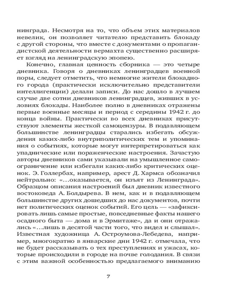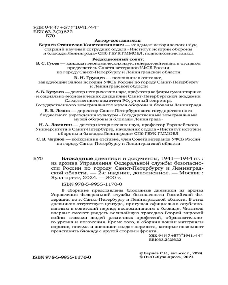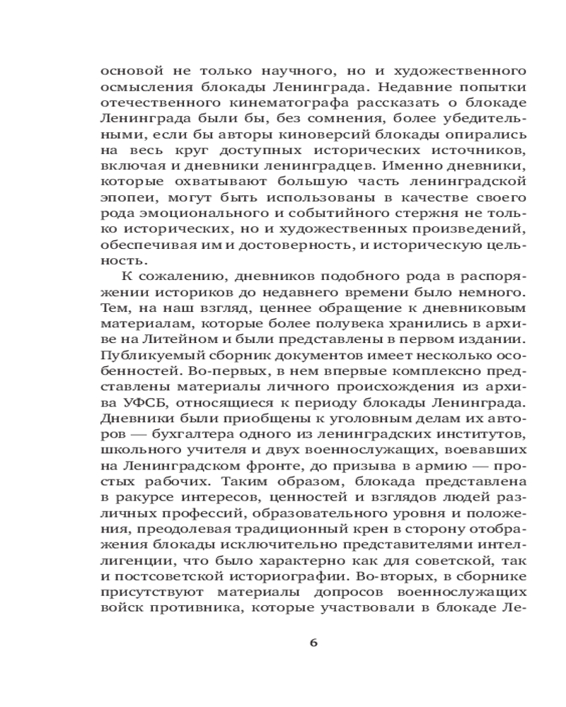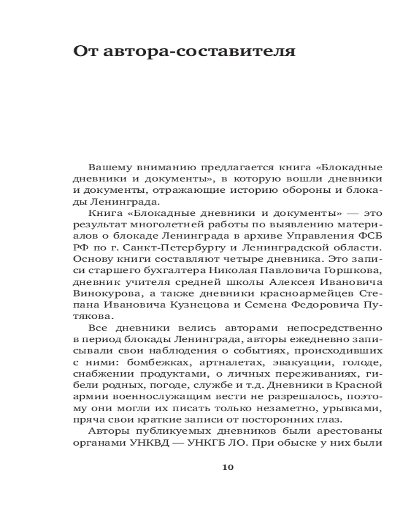 Серия: Блокада Ленинграда. Воспоминания В этом поистине уникальном сборнике представлены блокадные дневники из архива Управления Федеральной службы безопасности Российской Федерации по г. Санкт-Петербургу и Ленинградской области. В этих дневниках отсутствует цензура, присущая официально опубликованным в советский период воспоминаниям о блокаде. Они были приобщены к уголовным делам их авторов — бухгалтера одного из институтов, школьного учителя и двух красноармейцев, воевавших на Ленинградском фронте, до призыва — простых рабочих. Эти дневники дают поистине бесценное представление о повседневной жизни блокадного города, в них много деталей быта, описаний ощущений и страхов. Читатель впервые сможет увидеть блокаду Ленинграда глазами людей различных профессий, образовательного уровня и положения, преодолевая традиционный крен в сторону отображения величайшей трагедии Второй мировой войны исключительно представителями интеллигенции. |