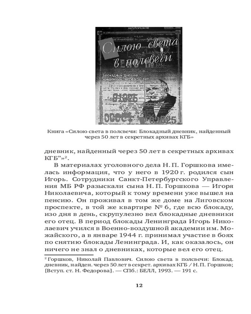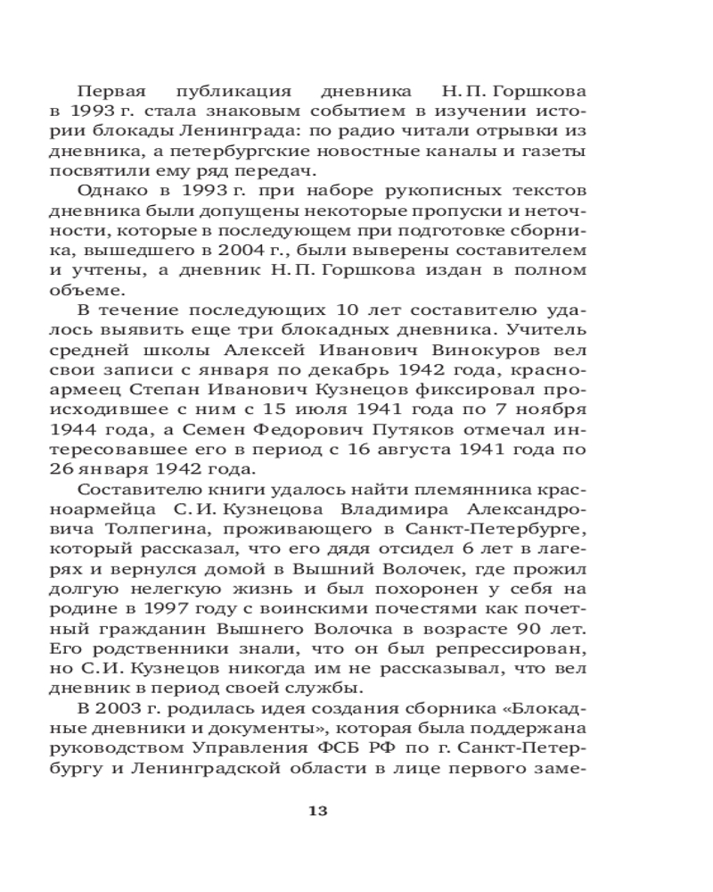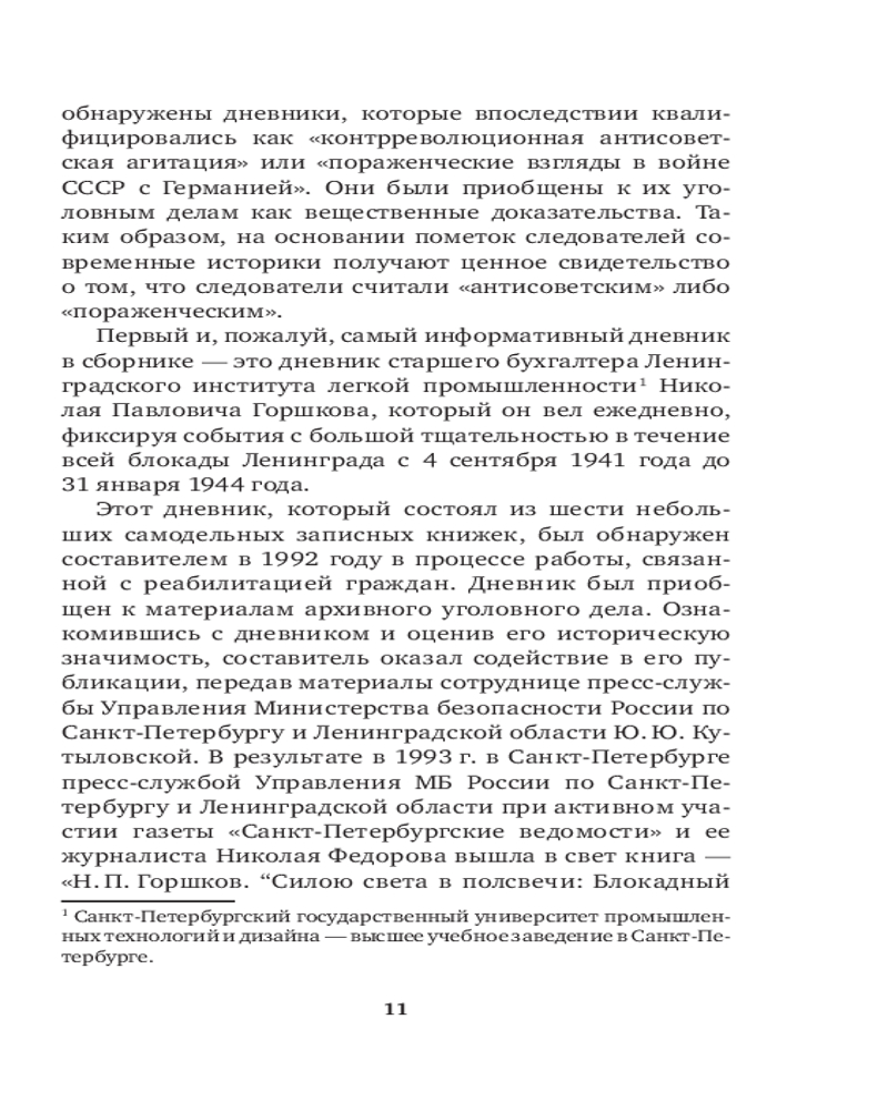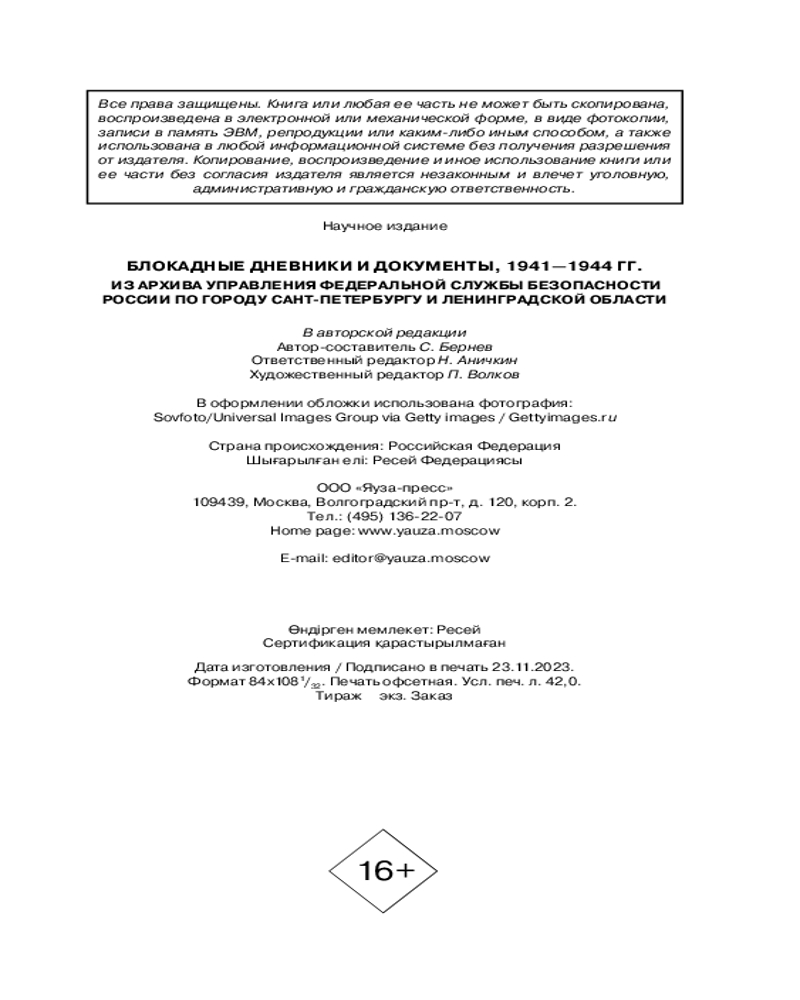 Серия: Блокада Ленинграда. Воспоминания В этом поистине уникальном сборнике представлены блокадные дневники из архива Управления Федеральной службы безопасности Российской Федерации по г. Санкт-Петербургу и Ленинградской области. В этих дневниках отсутствует цензура, присущая официально опубликованным в советский период воспоминаниям о блокаде. Они были приобщены к уголовным делам их авторов — бухгалтера одного из институтов, школьного учителя и двух красноармейцев, воевавших на Ленинградском фронте, до призыва — простых рабочих. Эти дневники дают поистине бесценное представление о повседневной жизни блокадного города, в них много деталей быта, описаний ощущений и страхов. Читатель впервые сможет увидеть блокаду Ленинграда глазами людей различных профессий, образовательного уровня и положения, преодолевая традиционный крен в сторону отображения величайшей трагедии Второй мировой войны исключительно представителями интеллигенции. |