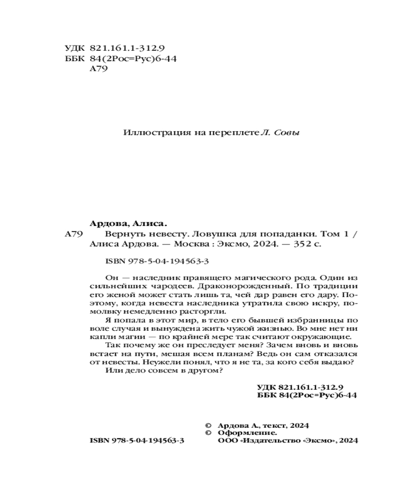 💳 Оплатить за товар можно при получении 🇰🇿 Есть бесплатная доставка по Казахстану от 1 дня 🎁 Копите бонусы с каждой покупки Серия: Магические миры Алисы Ардовой Он — наследник правящего магического рода. Один из сильнейших чародеев. Драконорожденный. По традиции, его женой может стать лишь та, чей дар равен его дару. Поэтому, когда невеста наследника утратила свою искру, помолвку немедленно расторгли. Я попала в этот мир, в тело его бывшей избранницы по воле случая и вынуждена жить чужой жизнью. Во мне нет ни капли магии — по крайней мере так считают окружающие. Так почему же он преследует меня? Зачем вновь и вновь встает на пути, мешая всем планам? Ведь он сам отказался от невесты. Неужели понял, что я не та, за кого себя выдаю? Или дело совсем в другом? |
