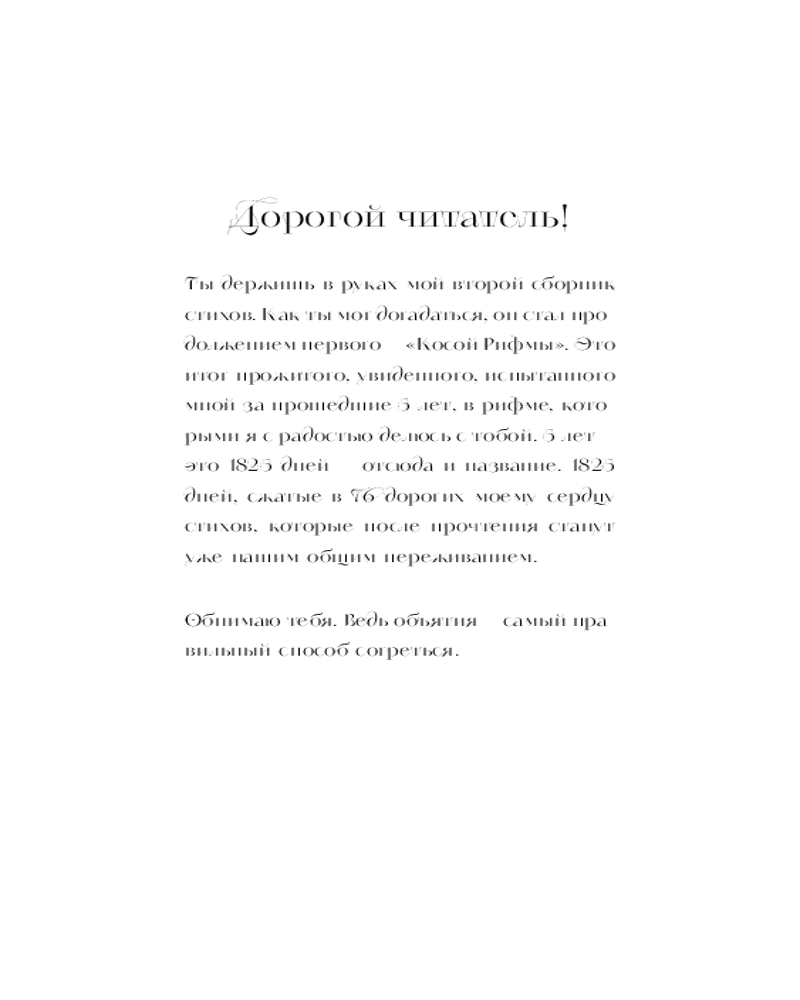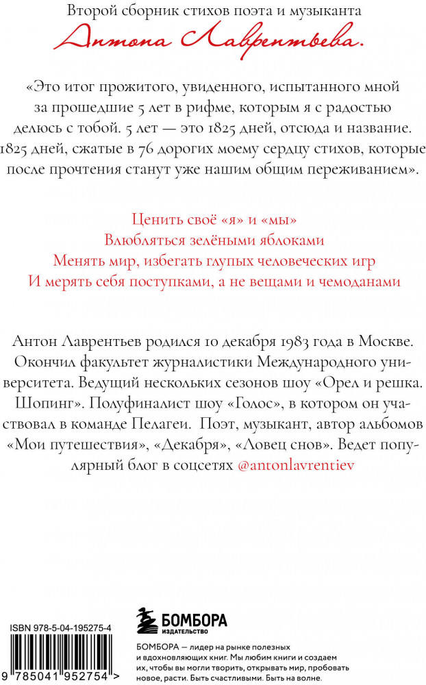 💳 Оплатить за товар можно при получении 🇰🇿 Есть бесплатная доставка по Казахстану от 1 дня 🎁 Копите бонусы с каждой покупки Серия: Поэты нашего времени. Лирика, меняющая сердца «Дорогой читатель! Это мой второй сборник стихов. Как ты мог догадаться, он стал продолжением первого — «Косой Рифмы». Это итог прожитого, увиденного, испытанного мной за прошедшие 5 лет, в рифме, которым я с радостью делюсь с тобой. 5 лет — это 1825 дней, — отсюда и название. 1825 дней, сжатые в 76 дорогих моему сердцу стихов, которые после прочтения станут уже нашим общим переживанием. Обнимаю тебя. Ведь объятия — самый правильный способ согреться». |