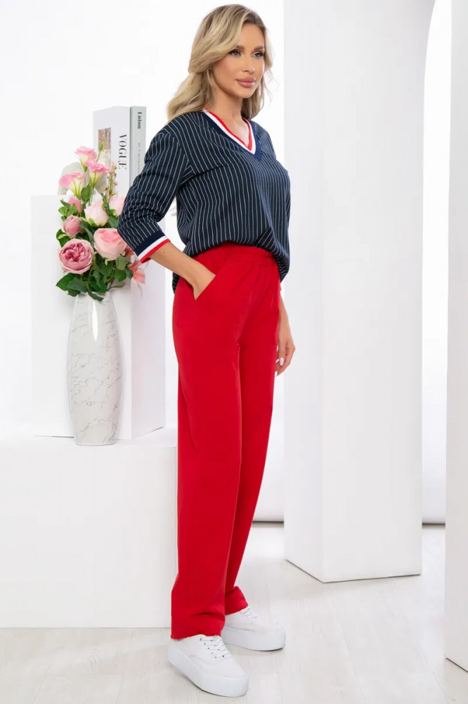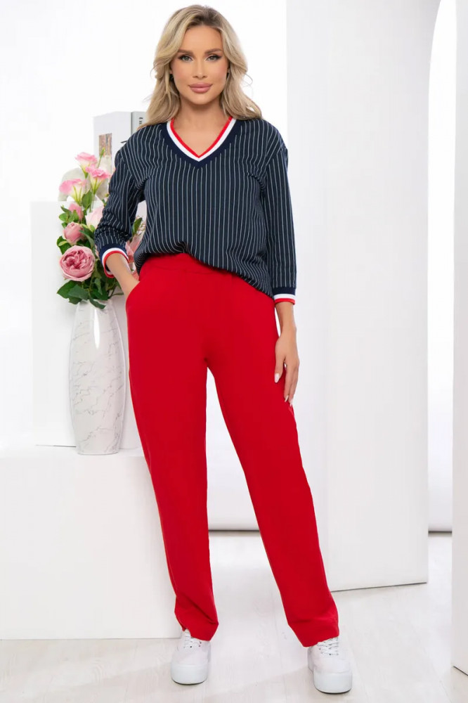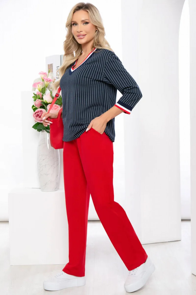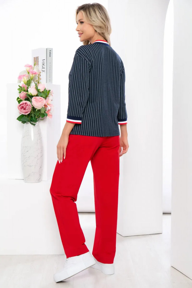 Понравился костюм. Соответствует размеру. Брюки из более плотного трикотажа, чем верх. Замечательно для прохладной погоды, для температуры воздуха 30+ в нем будет жарко.