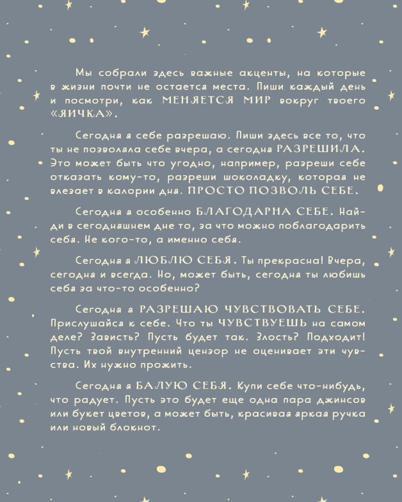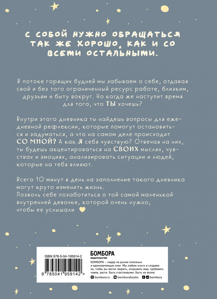 💳 Оплатить за товар можно при получении 🇰🇿 Есть бесплатная доставка по Казахстану от 1 дня 🎁 Копите бонусы с каждой покупки Серия: Письменные практики. Блокноты для честного диалога с собой В потоке горящих будней мы забываем о себе, отдавая свой и без того ограниченный ресурс работе, близким, друзьям и быту вокруг. Но когда же наступит время для того, что ты хочешь? Внутри этого дневника ты найдешь вопросы для ежедневной рефлексии, которые помогут остановиться и задуматься, а что на самом деле происходит со мной? А как Я себя чувствую? Отвечая на них, ты будешь акцентироваться на своих мыслях, чувствах и эмоциях, анализировать ситуации и людей, которые на тебя влияют. Всего 10 минут в день на заполнение такого дневника могут круто изменить жизнь. Позволь себе позаботиться о той самой маленькой внутренней девочке, которой очень нужно,чтобы ее услышали. |