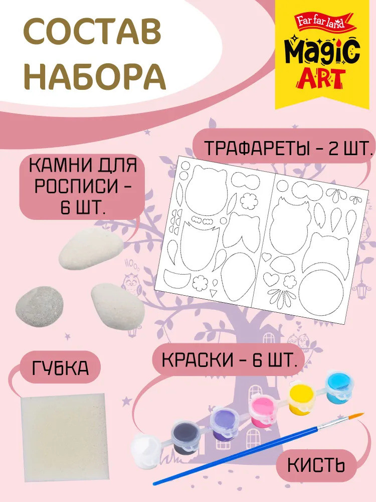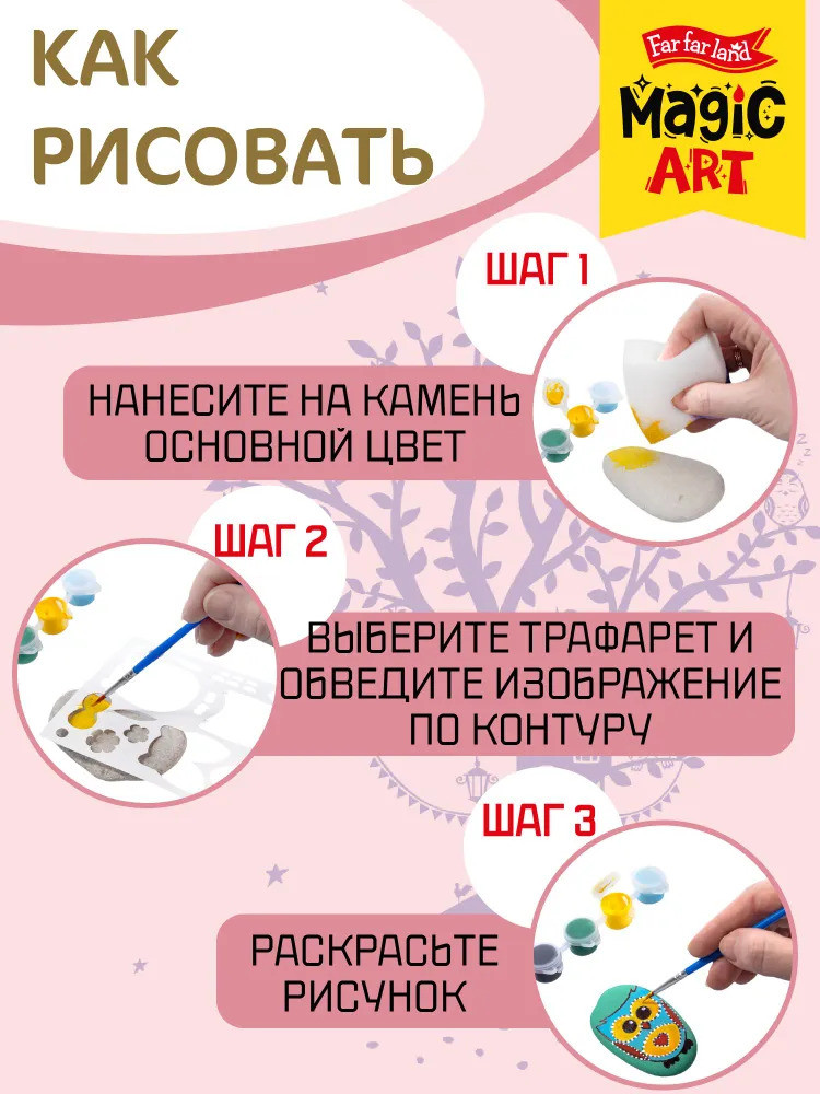 💳 Оплатить за товар можно при получении 🇰🇿 Есть бесплатная доставка по Казахстану от 1 дня 🎁 Копите бонусы с каждой покупки Серия: Magic art Роспись по камням «Забавные совы» (6 камней) — это набор для необычного творчества! Роспись камней дарит уникальные ощущения — вы получаете и расслабление во время медитативного нанесения жизнерадостных красок на твёрдую поверхность, и радующие глаз вещицы для декора дома и сада! Раскрашивать можно как показано на упаковке или на свой вкус. Экспериментируйте с цветами! Для получения новых оттенков, смешивайте краски на листе бумаги или палитре. Рекомендовано для детей старше 5 лет. |
