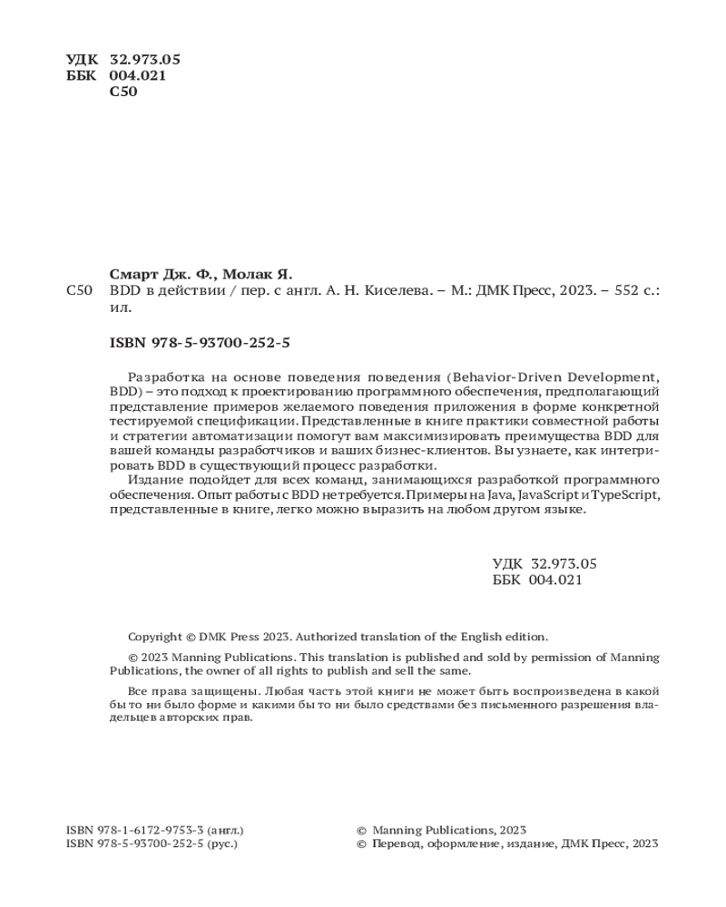 💳 Оплатить за товар можно при получении 🇰🇿 Есть бесплатная доставка по Казахстану от 1 дня 🎁 Копите бонусы с каждой покупки Разработка на основе поведения (Behavior-Driven Development, BDD) — это подход к проектированию программного обеспечения, предполагающий представление примеров желаемого поведения приложения в форме конкретной тестируемой спецификации. Представленные в книге практики совместной работы и стратегии автоматизации помогут вам максимизировать преимущества BDD для вашей команды разработчиков и ваших бизнес-клиентов. Вы узнаете, как интегрировать BDD в существующий процесс разработки. Это издание показывает, как интегрировать BDD с DevOps и крупномасштабными системами гибкой разработки. |