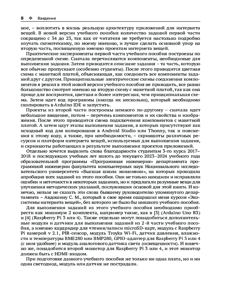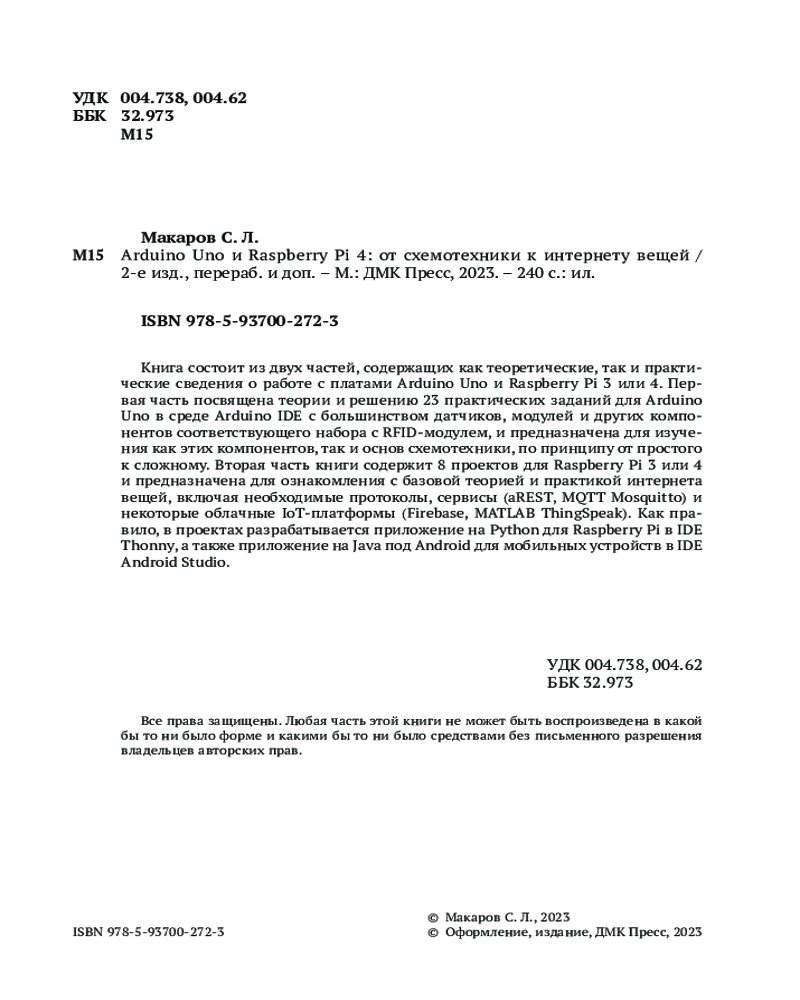 💳 Оплатить за товар можно при получении 🇰🇿 Есть бесплатная доставка по Казахстану от 1 дня 🎁 Копите бонусы с каждой покупки Книга состоит из двух частей, содержащих как теоретические, так и практические сведения о работе с платами Arduino Uno и Raspberry Pi 3 или 4. Первая часть посвящена теории и решению 23 практических заданий для Arduino Uno в среде Arduino IDE с большинством датчиков, модулей и других компонентов соответствующего набора с RFID-модулем, и предназначена для изучения как этих компонентов, так и основ схемотехники, по принципу от простого к сложному. |