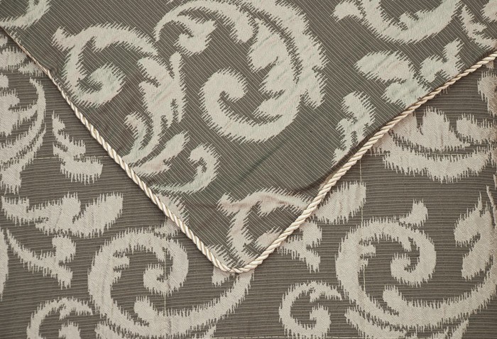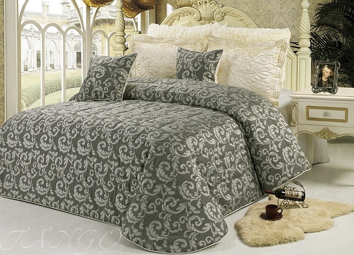 Жаккардовые покрывала «Tango» - это двухстороннее стеганое полотно из жаккарда и хлопка, между которыми находится тонкий слой синтепона. Плотность наполнителя 100г/м². Жаккардовые покрывала окантованы по краям косой бейкой.