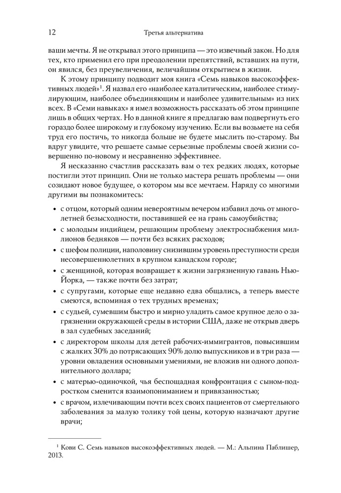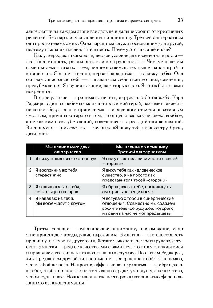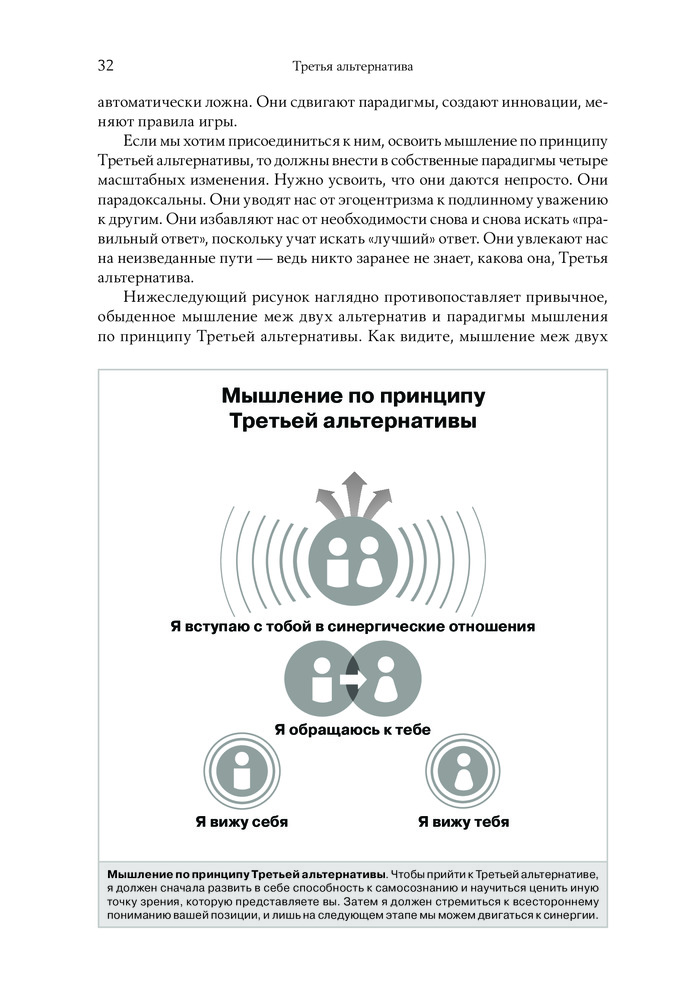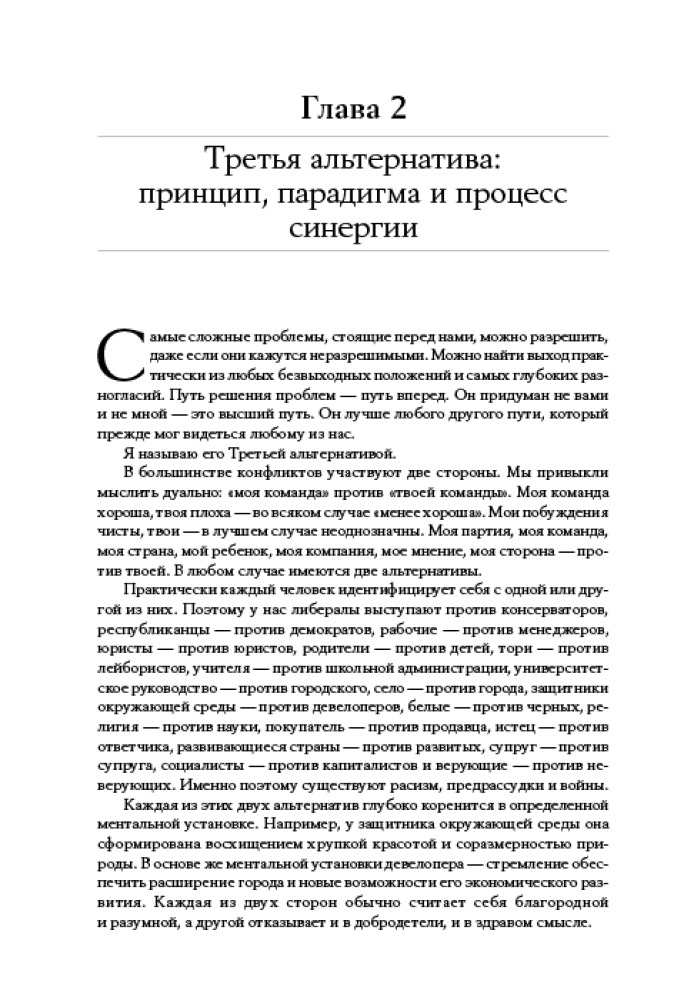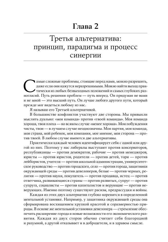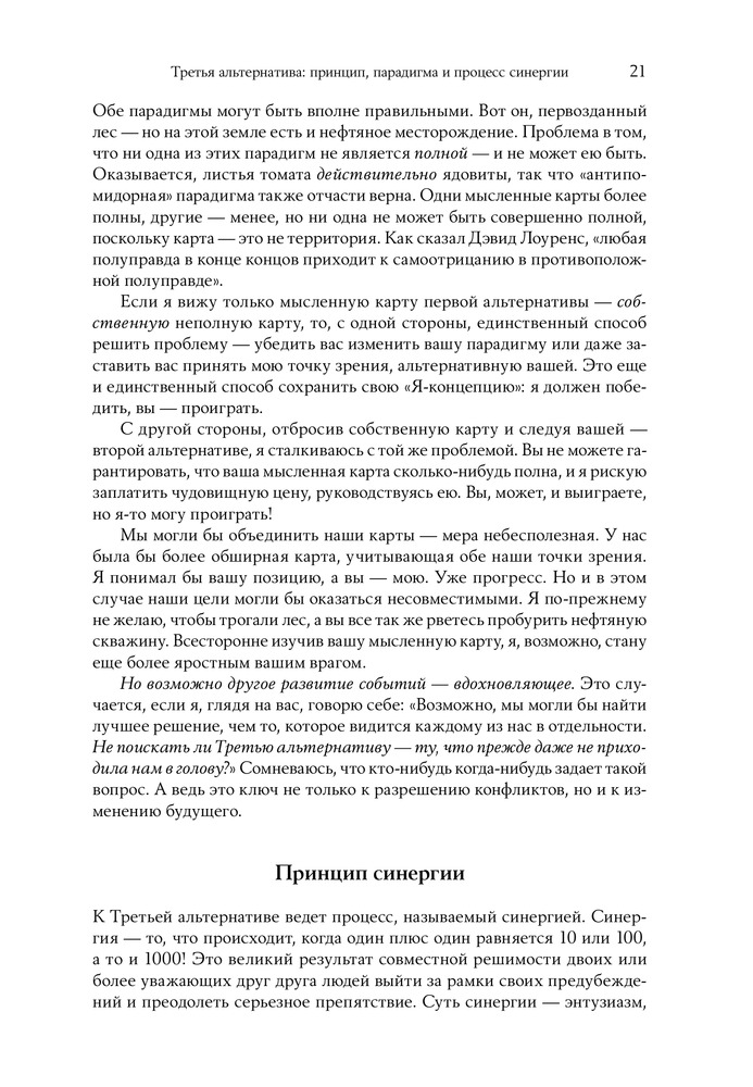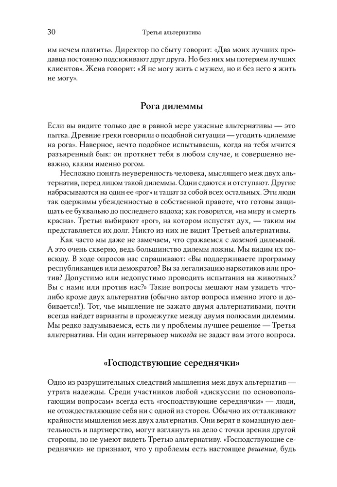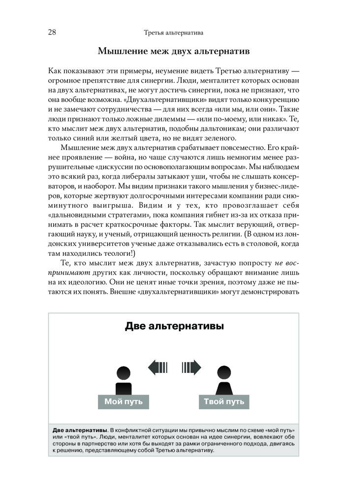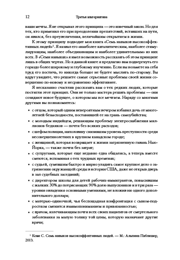 Третья альтернатива. Решение самых сложных жизненных проблемВ данный момент этот товар отсутствует в продаже. Возможно, у нас найдется аналогичный или похожий товар здесь. Многие из нас в спорных ситуациях привыкли мыслить меж двух альтернатив: если я выиграю, ты проиграешь, и наоборот. Стивен Кови предлагает Третью альтернативу — революционный подход к урегулированию конфликтов, основанный на синергии. Как сплав прочнее каждого из составляющих его металлов, так и синергия — не компромисс, а нечто новое, соединение таланта и творческих способностей противоборствующих сторон, благодаря чему принятое ими креативное решение превосходит те, что каждая из них предлагала по отдельности. Третья альтернатива открывает радикально новый и творческий стиль мышления, позволяющий подняться и над конфликтами, и над компромиссами. |