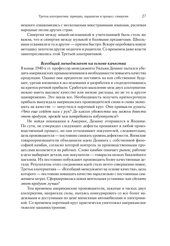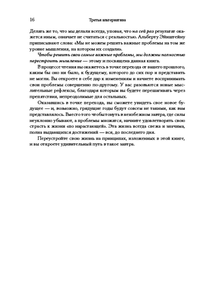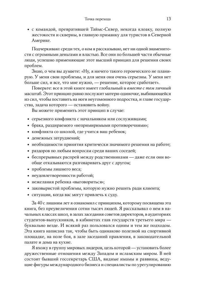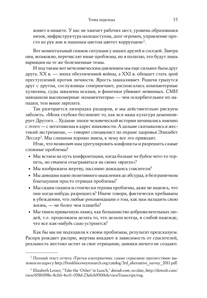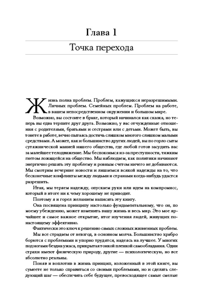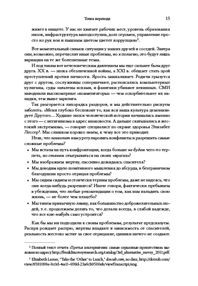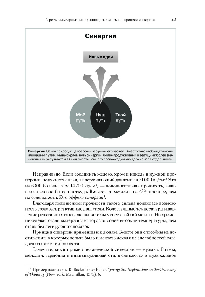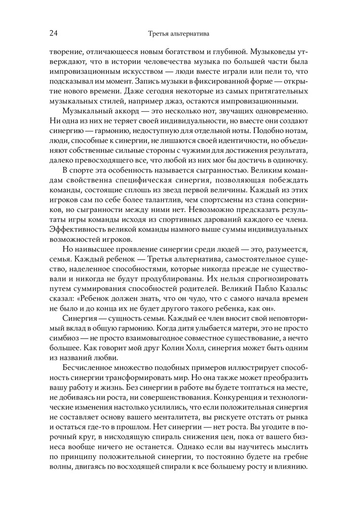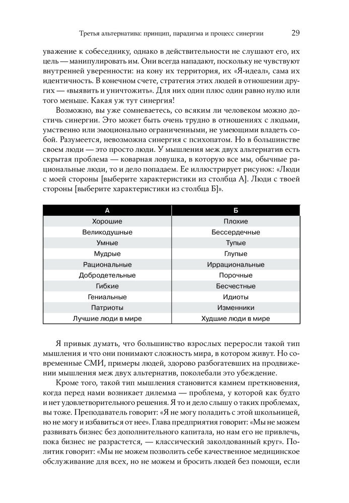 Третья альтернатива. Решение самых сложных жизненных проблемВ данный момент этот товар отсутствует в продаже. Возможно, у нас найдется аналогичный или похожий товар здесь. Многие из нас в спорных ситуациях привыкли мыслить меж двух альтернатив: если я выиграю, ты проиграешь, и наоборот. Стивен Кови предлагает Третью альтернативу — революционный подход к урегулированию конфликтов, основанный на синергии. Как сплав прочнее каждого из составляющих его металлов, так и синергия — не компромисс, а нечто новое, соединение таланта и творческих способностей противоборствующих сторон, благодаря чему принятое ими креативное решение превосходит те, что каждая из них предлагала по отдельности. Третья альтернатива открывает радикально новый и творческий стиль мышления, позволяющий подняться и над конфликтами, и над компромиссами. |