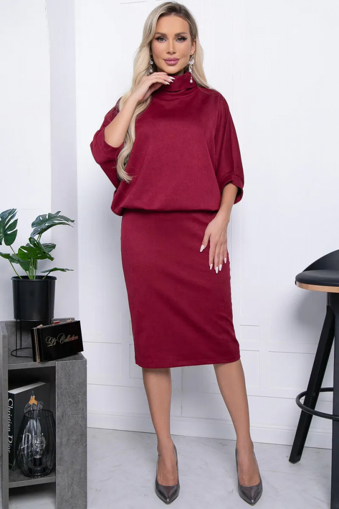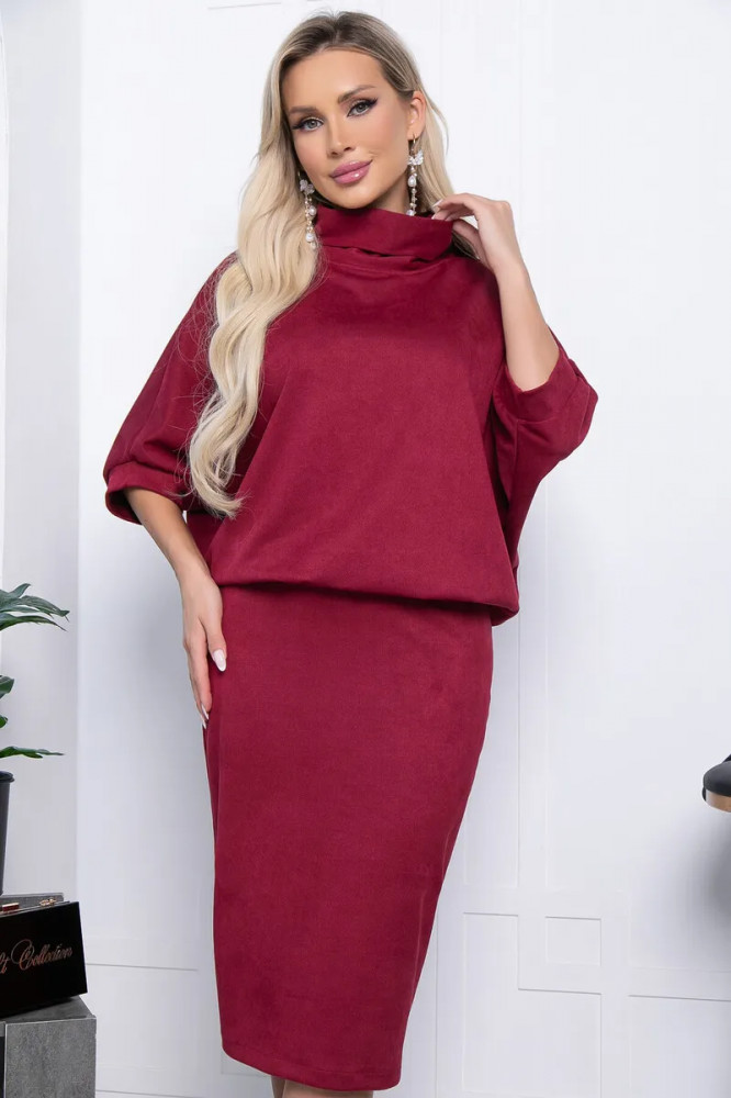 Выкупила платье в двух цветах. Ткань вискоза с эластаном. Модель интересного и фасона, рукав летучая мышь, воротник мягкая стойка, лиф свободный, ниспадающий, талия отрезная, юбка прямая. За счет эластичности, платье надевается без молний, застежек. На рост 175 слегка прикрывает колено. Прилагается пояс из такой же ткани и легкое украшение.