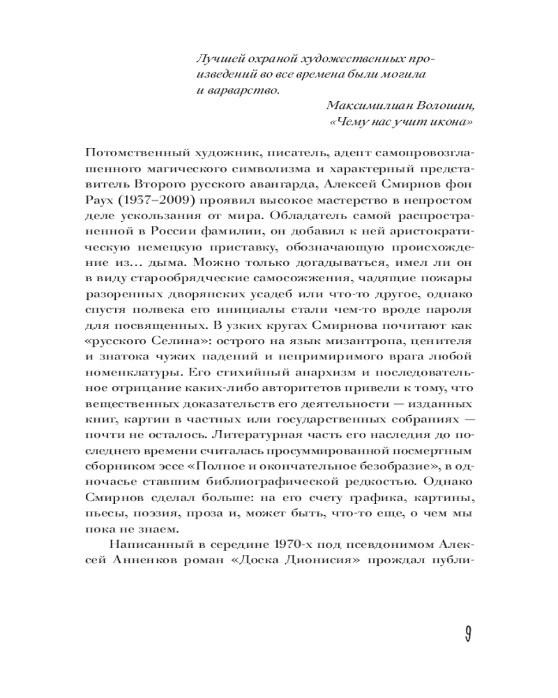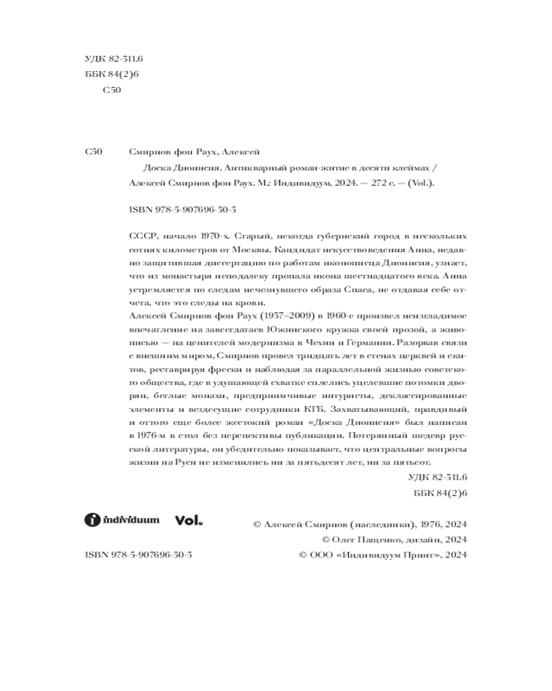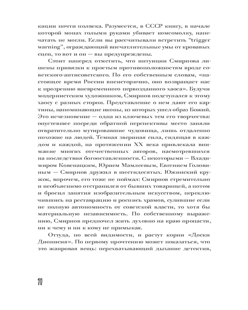 Алексей Смирнов фон Раух (1937-2009) в 1960-е произвел неизгладимое впечатление на завсегдатаев Южинского кружка своей прозой, а живописью — на ценителей модернизма в Чехии и Германии. Разорвав связи с внешним миром, Смирнов провел тридцать лет в стенах церквей и скитов, реставрируя фрески и наблюдая за параллельной жизнью советского общества, где в удушающей схватке сплелись уцелевшие потомки дворян, беглые монахи, предприимчивые интуристы, деклассированные элементы и вездесущие сотрудники КГБ. Захватывающий, правдивый и оттого еще более жестокий роман «Доска Дионисия» был написан в 1976-м в стол без перспективы публикации. Потерянный шедевр русской литературы, он убедительно показывает, что центральные вопросы жизни на Руси не изменились ни за пятьдесят лет, ни за пятьсот. |