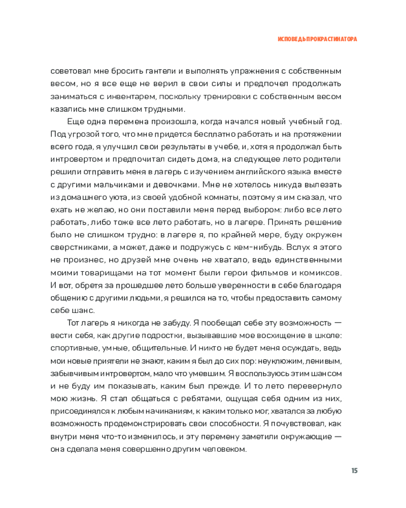 Открыть свой бизнес и планировать совершить прорыв, который принесет тебе финансовую свободу, но продолжать двигаться по прежней траектории. Все это — следствия прокрастинации, или привычки откладывать на потом. В своей книге Педро Вивар дает нам ключ к пониманию того, как работает прокрастинация и каким образом ее побороть, чтобы максимально развить наши физические и ментальные способности. Он предлагает ряд стратегий и инструментов, с помощью которых мы можем в полной мере раскрыть свой потенциал.