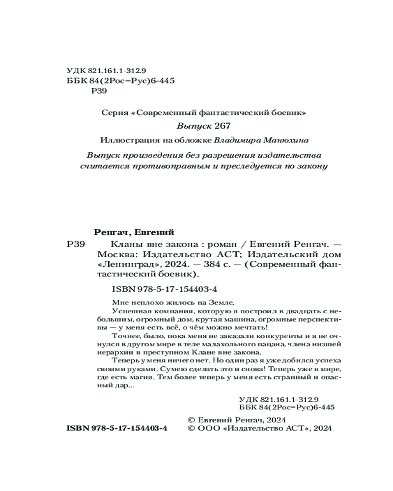 💳 Оплатить за товар можно при получении 🇰🇿 Есть бесплатная доставка по Казахстану от 1 дня 🎁 Копите бонусы с каждой покупки Серия: Современный фантастический боевик Мне неплохо жилось на Земле. Успешная компания, которую я построил в двадцать с небольшим, огромный дом, крутая машина, огромные перспективы — у меня есть всё, о чём можно мечтать! Точнее, было, пока меня не заказали конкуренты и я не очнулся в другом мире в теле малахольного пацана, члена низшей иерархии в преступном Клане вне закона. Теперь у меня ничего нет. Но один раз я уже добился успеха своими руками. Сумею сделать это и снова! Теперь уже в мире, где есть магия. Тем более теперь у меня есть странный и опасный дар... |