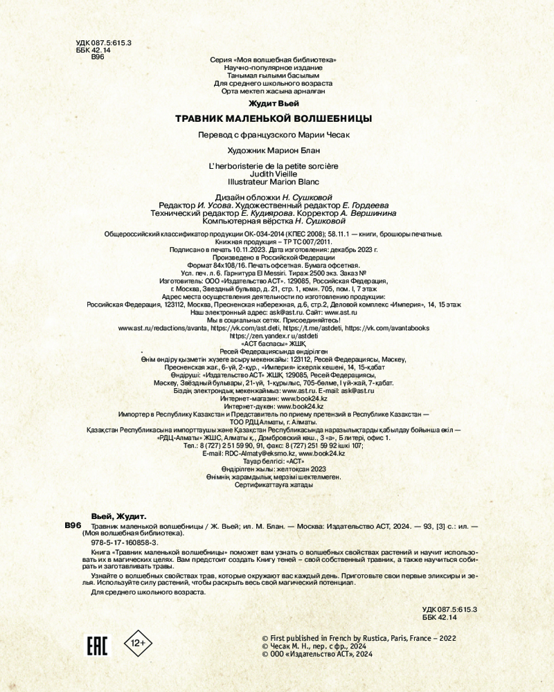💳 Оплатить за товар можно при получении 🇰🇿 Есть бесплатная доставка по Казахстану от 1 дня 🎁 Копите бонусы с каждой покупки Серия: Моя волшебная библиотека Книга «Травник маленькой волшебницы» поможет вам узнать о волшебных свойствах растений и научит использовать их в магических целях. Вам предстоит создать Книгу теней — свой собственный травник, а также научиться собирать и заготавливать травы. Узнайте о волшебных свойствах трав, которые окружают вас каждый день. Приготовьте свои первые эликсиры и зелья. Используйте силу растений, чтобы раскрыть весь свой магический потенциал. |