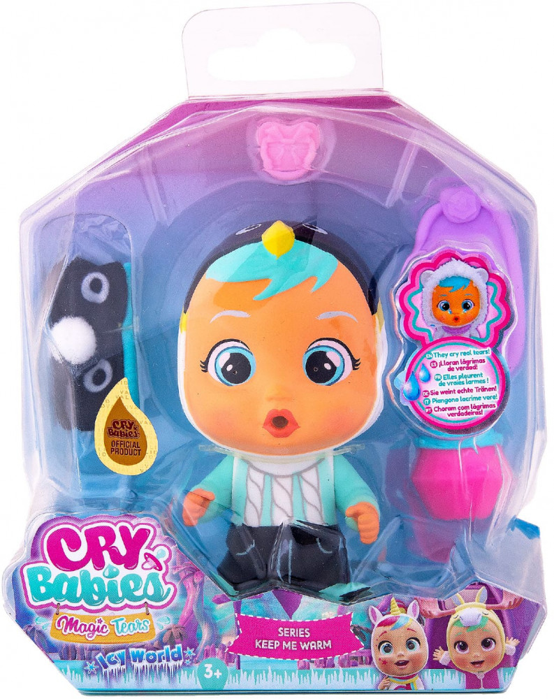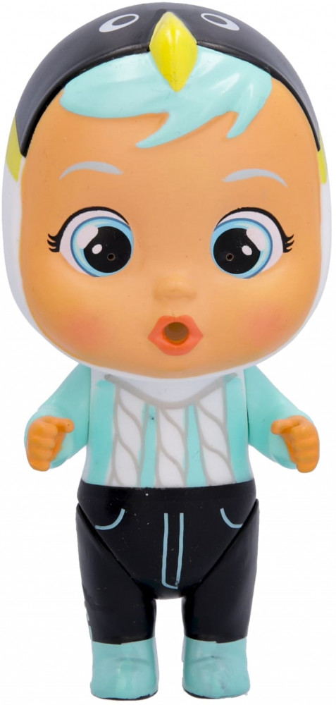 Кукла высотой 12 см, с подвижными ручками и ножками. Если нажать на его животик, он начнет плакать настоящими слезами. Согрей Коди и дай ему пустышку, и он снова станет счастливым! Для того чтобы слезы вытекали из глаз при нажатии на животик, необходимо залить воду в специальный отсек на голове куклы и вынуть пустышку.
