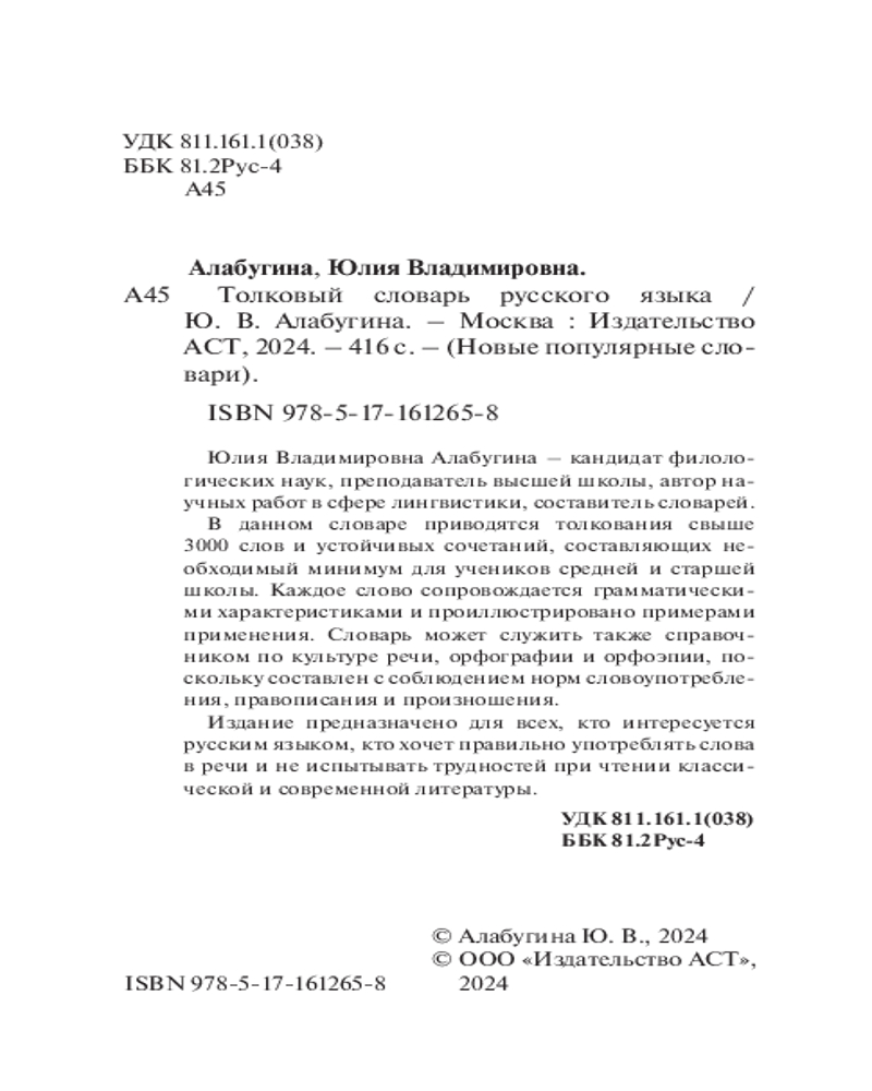 💳 Оплатить за товар можно при получении 🇰🇿 Есть бесплатная доставка по Казахстану от 1 дня 🎁 Копите бонусы с каждой покупки Серия: Новые популярные словари Юлия Владимировна Алабугина — кандидат филологических наук, преподаватель высшей школы, автор научных работ в сфере лингвистики, составитель словарей. В данном словаре приводятся толкования свыше 3000 слов и устойчивых сочетаний, составляющих необходимый минимум для учеников средней и старшей школы. Каждое слово сопровождается грамматическими характеристиками и проиллюстрировано примерами применения. Словарь может служить также справочником по культуре речи, орфографии и орфоэпии, поскольку составлен с соблюдением норм словоупотребления, правописания и произношения. Издание предназначено для всех, кто интересуется русским языком, кто хочет правильно употреблять слова в речи и не испытывать трудностей при чтении классической и современной литературы. |