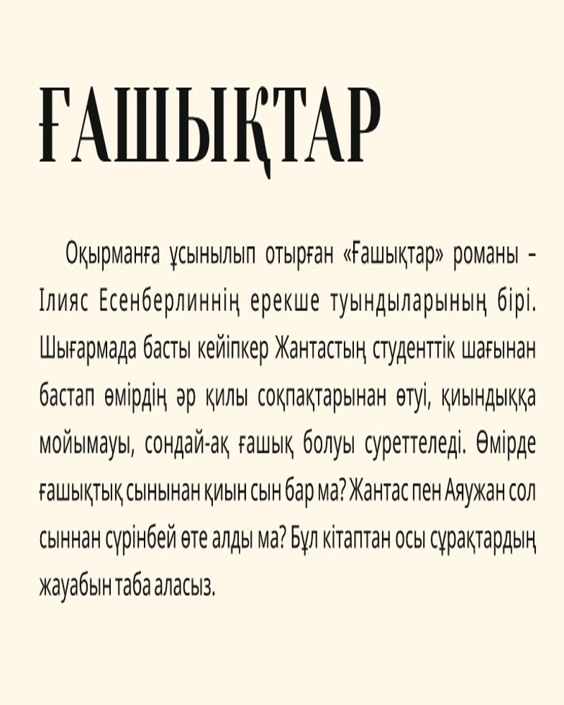 💳 Оплатить за товар можно при получении 🇰🇿 Есть бесплатная доставка по Казахстану от 1 дня 🎁 Копите бонусы с каждой покупки Серия: Qazaq classics Оқырманға ұсынылып отырған «Ғашықтар» романы — Ілияс Есенберлиннің ерекше туындыларының бірі. Шығармада басты кейіпкер Жантастың студенттік шағынан бастап өмірдің әр қилы соқпақтарынан өтуі, қиындыққа мойымауы, сондай-ақ ғашық болуы суреттеледі. Өмірде ғашықтық сынынан қиын сын бар ма? Жантас пен Аяужан сол сыннан сүрінбей өте алды ма? Бұл кітаптан осы сұрақтардың жауабын таба аласыз. |
