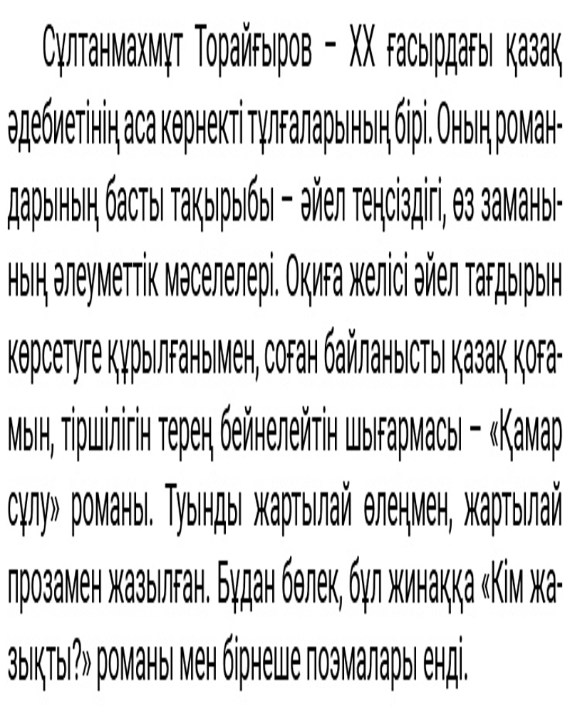 Сұлтанмахмұт Торайғыров — казахский поэт, Родился в семье скотовода. Происходит из подрода Айдабол рода Суйиндык племени Аргын Среднего жуза. Его мать умерла, когда ему исполнилось три года. Закончил медресе (1908—1910). В конце 1912 года Торайгыров приехал в Троицк, поступил в духовную мусульманскую школу Расулия: изучал науки, овладевал русским языком — читал Лермонтова, Пушкина, Крылова. В июле 1913 года оставил учёбу из-за болезни и уехал обучать детей в ауле. С 1913 года работал... |