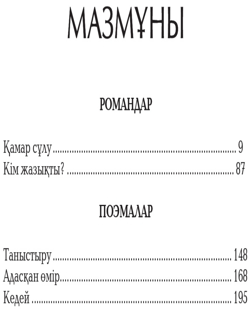 Серия: Мектеп кітапханасы Сұлтанмахмұт Торайғыров — XX ғасырдағы қазақ әдебиетінің аса көрнекті тұлғаларының бірі. Оның романдарының басты тақырыбы — әйел теңсіздігі, өз заманының әлеуметтік мәселелері. Оқиға желісі әйел тағдырын көрсетуге құрылғанымен, соған байланысты қазақ қоғамын, тіршілігін терең бейнелейтін шығармасы — «Қамар сұлу» романы. Туынды жартылай өлеңмен, жартылай прозамен жазылған. Бұдан бөлек, бұл жинаққа «Кім жазықты?» романы мен бірнеше поэмалары енді. |