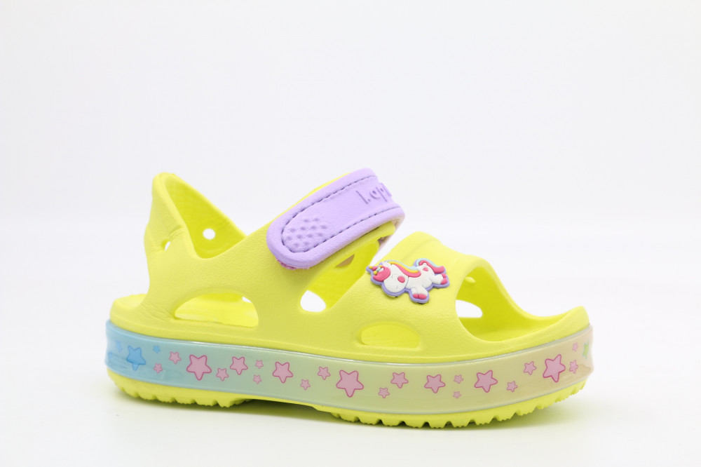 Открытые пляжные сандалии — наш хит! Классный дизайн, эффектные цветовые решения, съемный декор-пуговица, а главное достоинство — светодиоды в подошве. В модели есть липучка, которой можно отрегулировать посадку на ножке. Каждая девочка будет в восторге от такой модели!
