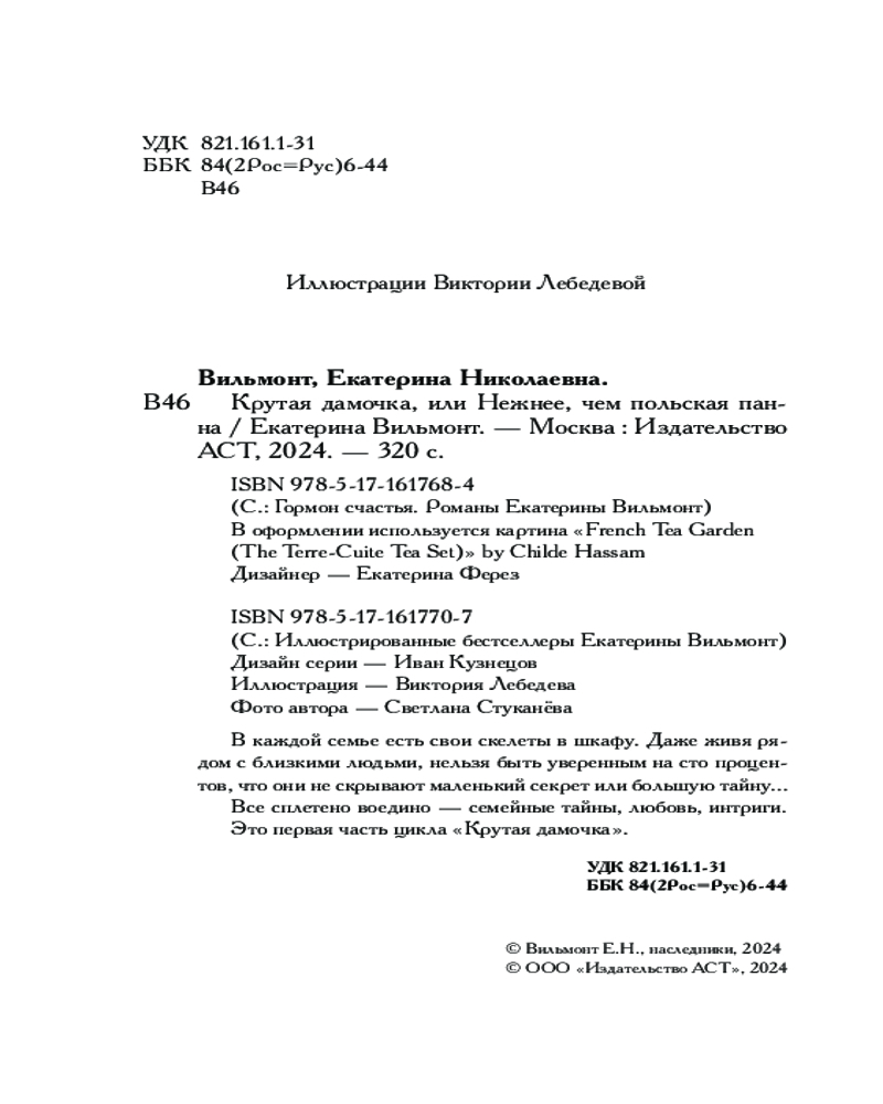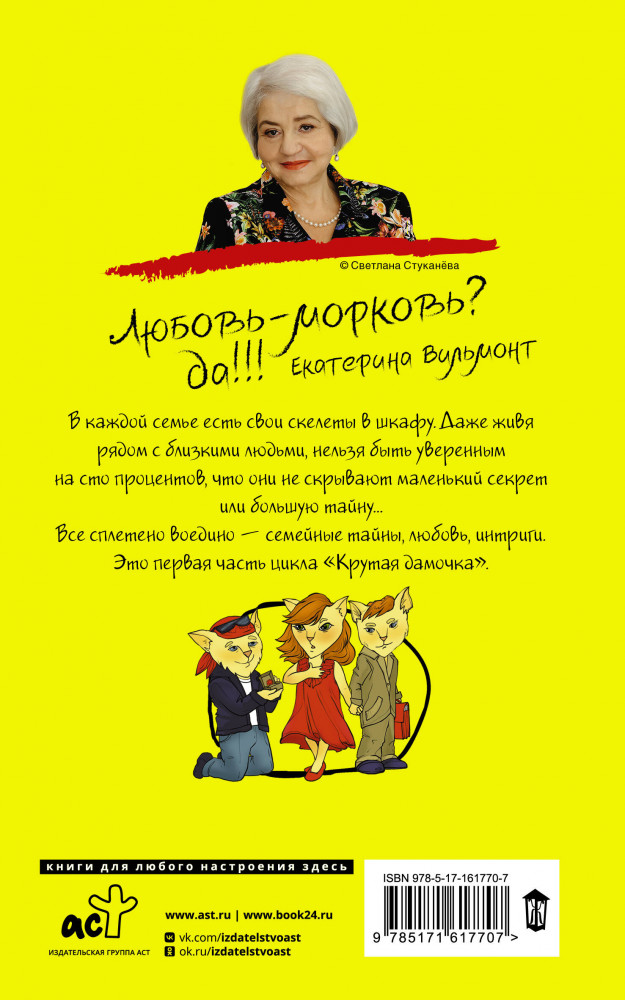 💳 Оплатить за товар можно при получении 🇰🇿 Есть бесплатная доставка по Казахстану от 1 дня 🎁 Копите бонусы с каждой покупки Серия: Иллюстрированные бестселлеры Екатерины Вильмонт В каждой семье есть свои скелеты в шкафу. Даже живя рядом с близкими людьми, нельзя быть уверенным на сто процентов, что они не скрывают маленький секрет или большую тайну... Все сплетено воедино — семейные тайны, любовь, интриги. Это первая часть цикла «Крутая дамочка». |