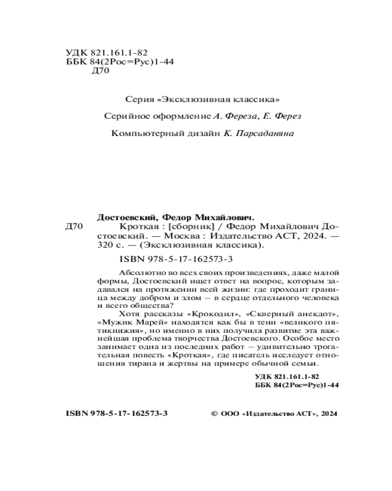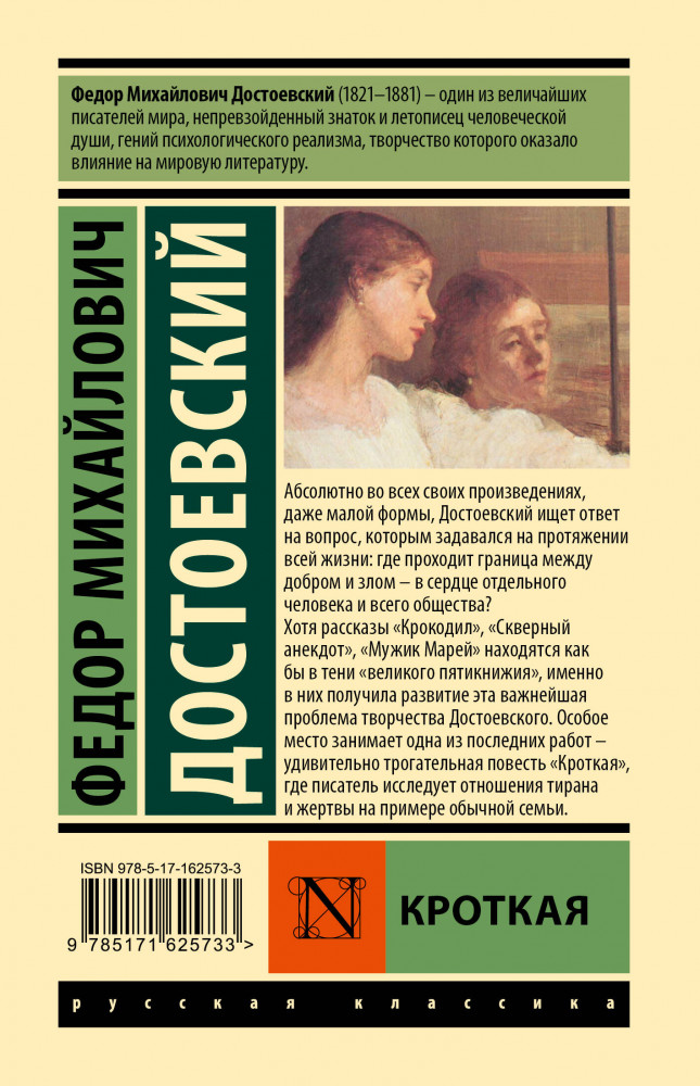 💳 Оплатить за товар можно при получении 🇰🇿 Есть бесплатная доставка по Казахстану от 1 дня 🎁 Копите бонусы с каждой покупки Серия: Эксклюзивная классика (Лучшее) Абсолютно во всех своих произведениях, даже малой формы, Достоевский ищет ответ на вопрос, которым задавался на протяжении всей своей жизни: где проходит граница между добром и злом — в сердце отдельного человека и всего общества? Хотя рассказы «Крокодил», «Скверный анекдот», «Мужик Марей» находятся как бы в тени «великого пятикнижия», но именно в них получила развитие эта важнейшая проблема творчества Достоевского. Особое место занимает одна из последних работ — удивительно трогательная повесть «Кроткая», где писатель исследует отношения тирана и жертвы на примере обычной семьи. |