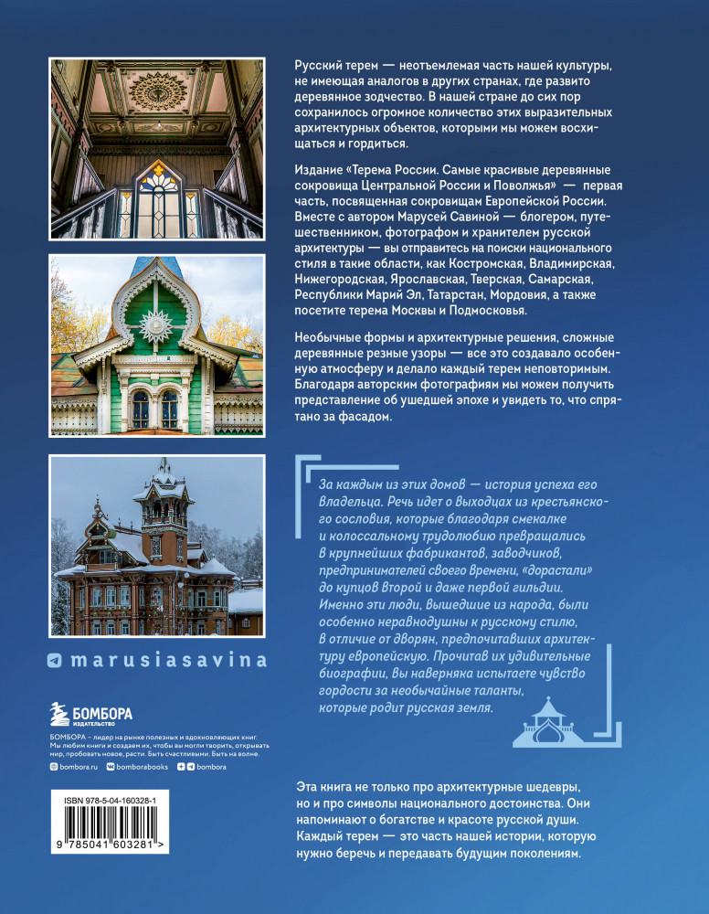 Издание «Терема России. Самые красивые деревянные сокровища Центральной России и Поволжья» посвящено невероятным сокровищам Центральной и Европейской части России. Вместе с автором, Марусей Савиной — блогером, фотографом, исследователем и хранителем русской архитектуры, вы отправитесь на поиски национального стиля в такие области, как Костромская, Владимирская, Нижегородская, Ярославская, Тверская, Самарская, Республики Марий Эл, Татарстан, Мордовия, а также посетите терема Москвы и Подмосковья. Необычные формы и архитектурные решения, сложные деревянные резные узоры — все это создавало особенную атмосферу и делало каждый терем неповторимым. Благодаря авторским фотографиям мы можем получить представление об ушедшей эпохе и увидеть то, что спрятано за фасадом.